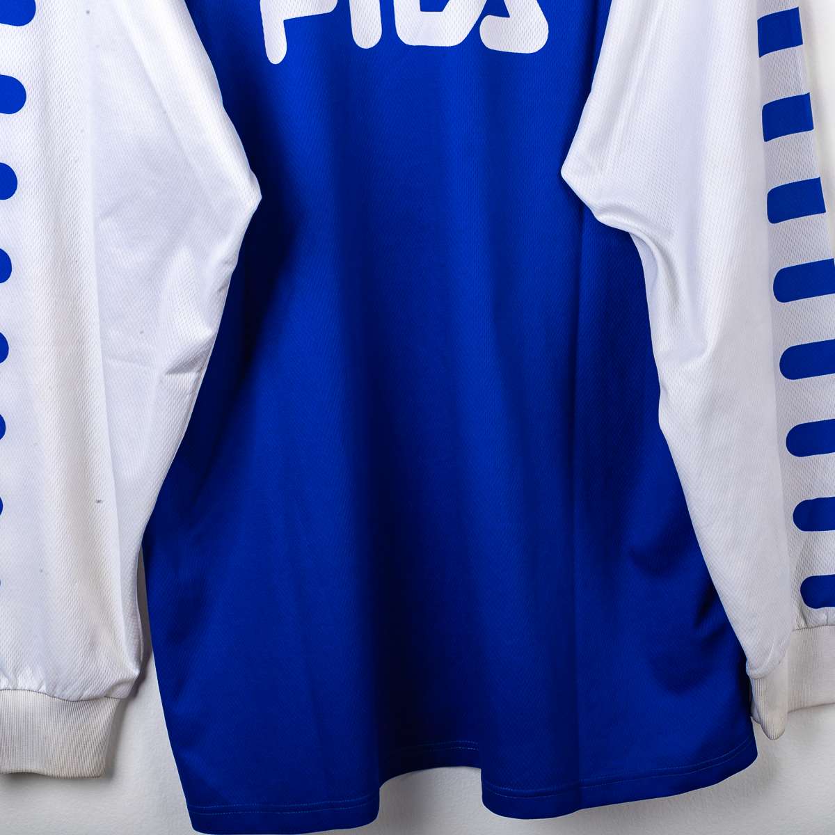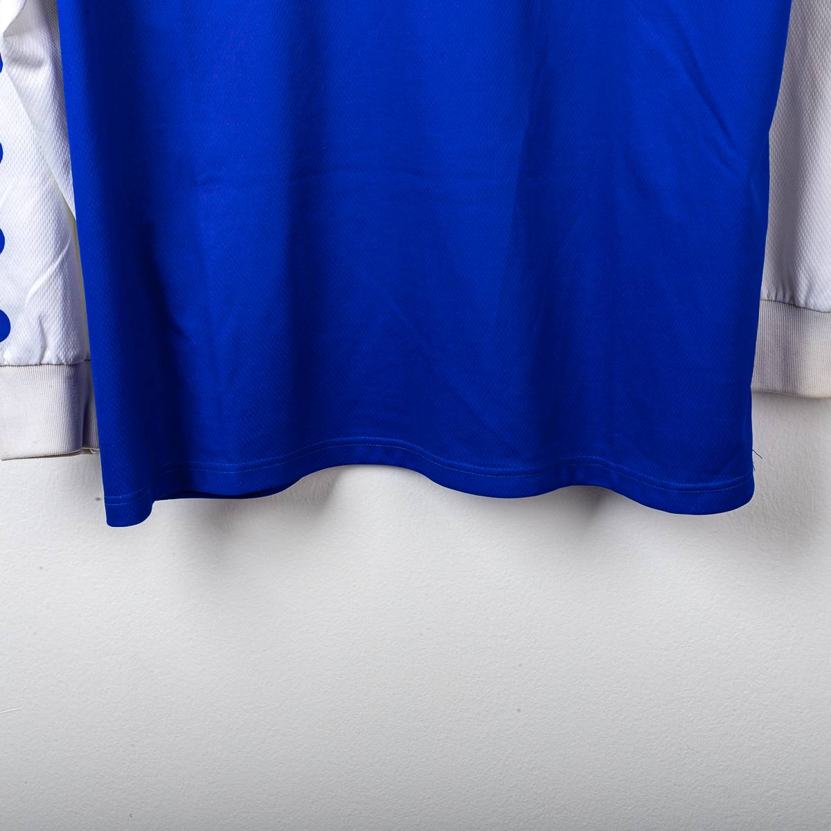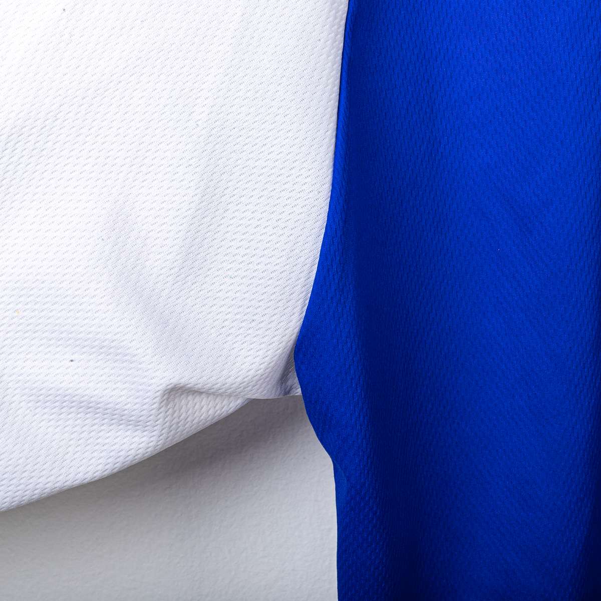 ACF Fiorentina training jersey from the 1999/2000 season, produced by Fila. Long-sleeved model made of 100% polyester technical fabric in royal blue with contrasting white sleeves, lightweight and breathable, designed for training. White ribbed V-neck and matching elastic cuffs. Fila logo and Toyota sponsor printed centrally on the front; Toyota Fila sponsor also replicated on the back. Loose and comfortable fit, essential training-field design. Fila label inside with size XXL, composition and production Made in Italy.