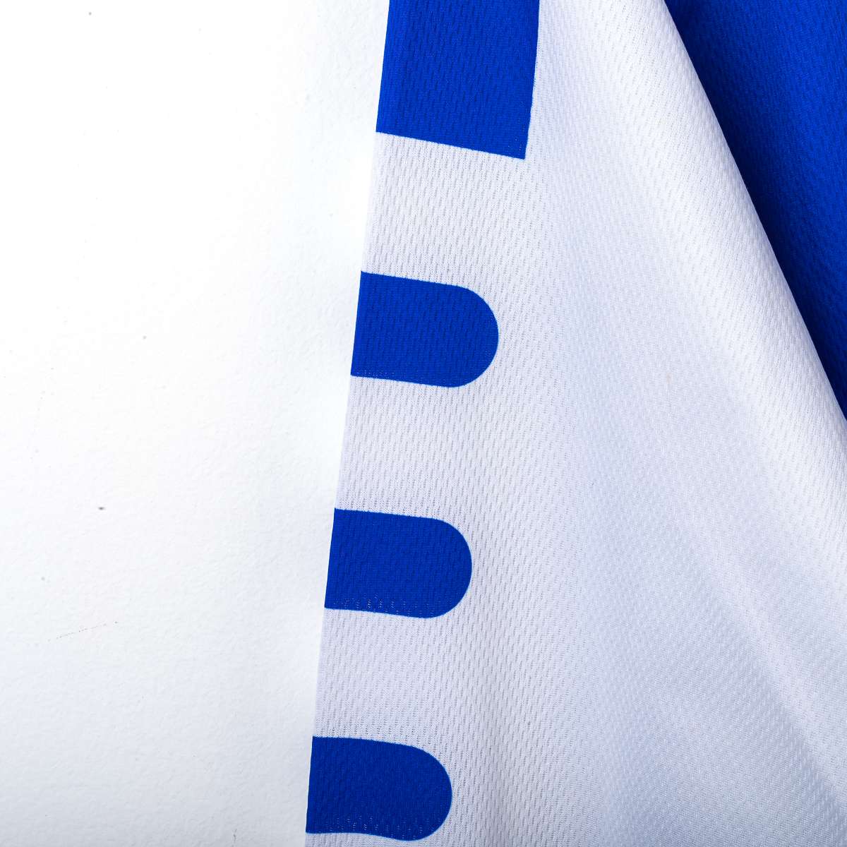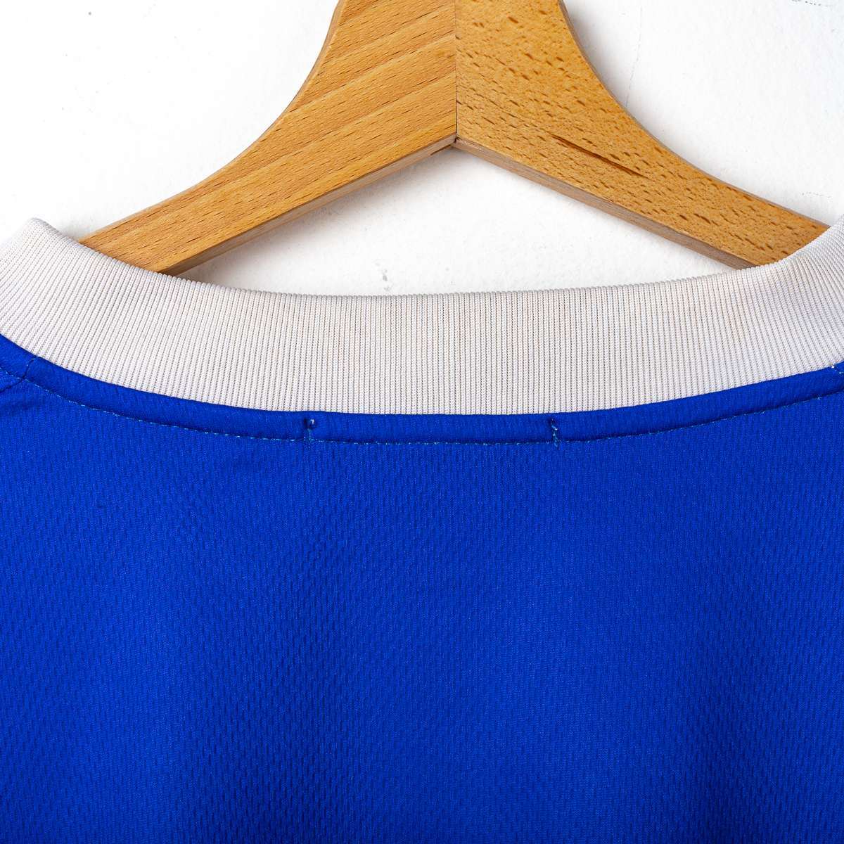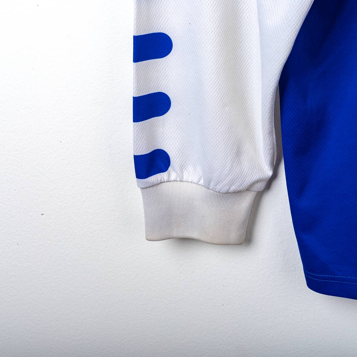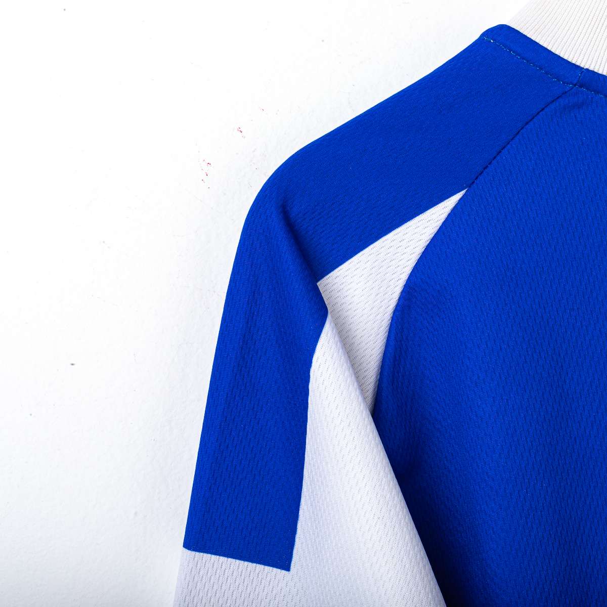 ACF Fiorentina training jersey from the 1999/2000 season, produced by Fila. Long-sleeved model made of 100% polyester technical fabric in royal blue with contrasting white sleeves, lightweight and breathable, designed for training. White ribbed V-neck and matching elastic cuffs. Fila logo and Toyota sponsor printed centrally on the front; Toyota Fila sponsor also replicated on the back. Loose and comfortable fit, essential training-field design. Fila label inside with size XXL, composition and production Made in Italy.