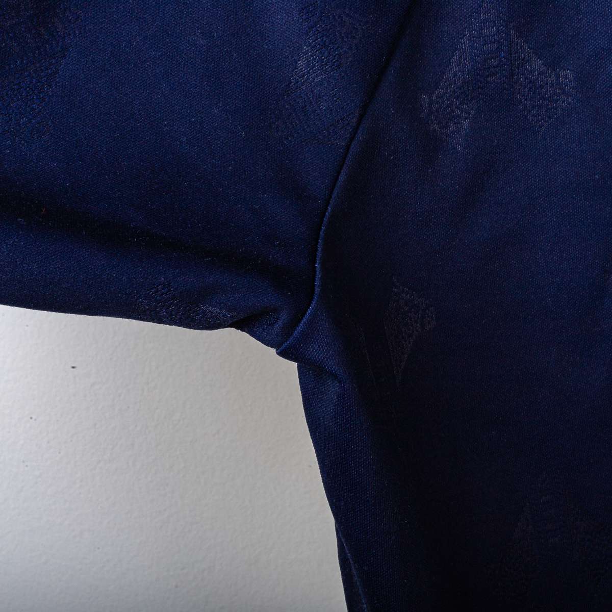 Maglia away dell’Hellas Verona F.C. stagione 1996/1997, prodotta da Erreà. Design iconico anni ’90 caratterizzato da base blu navy con ampi inserti gialli a contrasto sul fronte e sulle maniche, che incorniciano il grande stemma centrale Hellas Verona. Colletto a V con inserto giallo e profili bianchi e blu, maniche corte con bordi elasticizzati coordinati e dettaglio tessuto “Hellas 1903” applicato. Sul petto logo Erreà applicato lato destro e sponsor principale “Ferroli” applicato al centro sopra lo stemma del club. Patch Hellas Verona applicata sulla manica. Tessuto in poliestere leggero con pattern tono su tono visibile sul corpo della maglia. Etichetta interna Erreà con licensing ufficiale Hellas Verona.