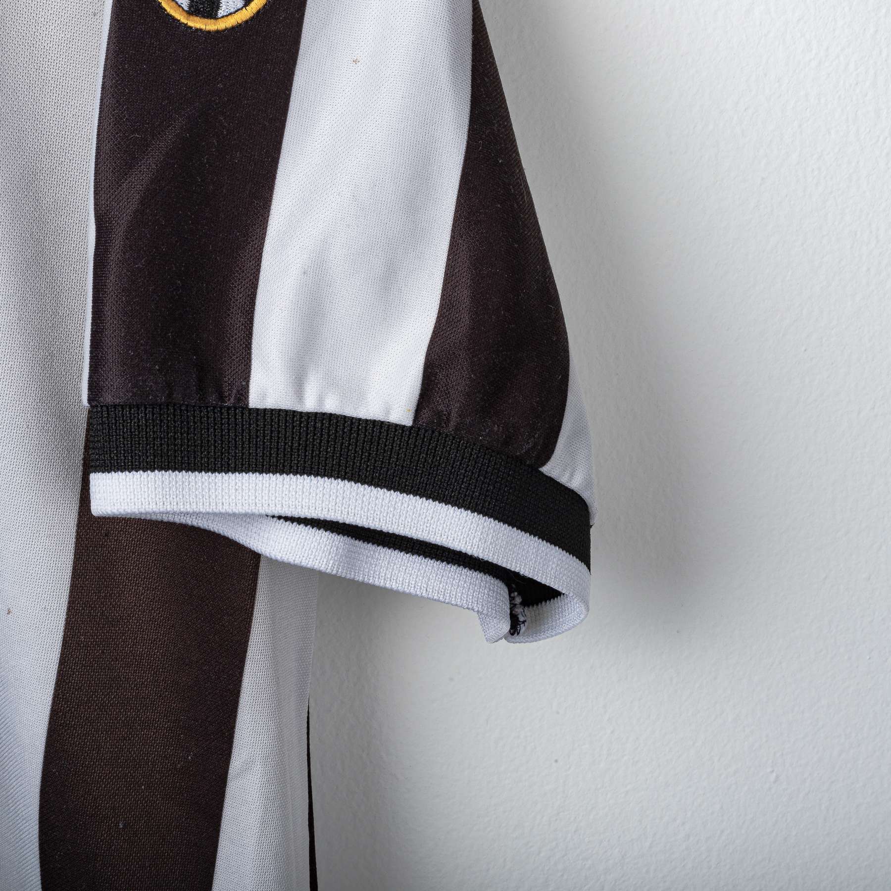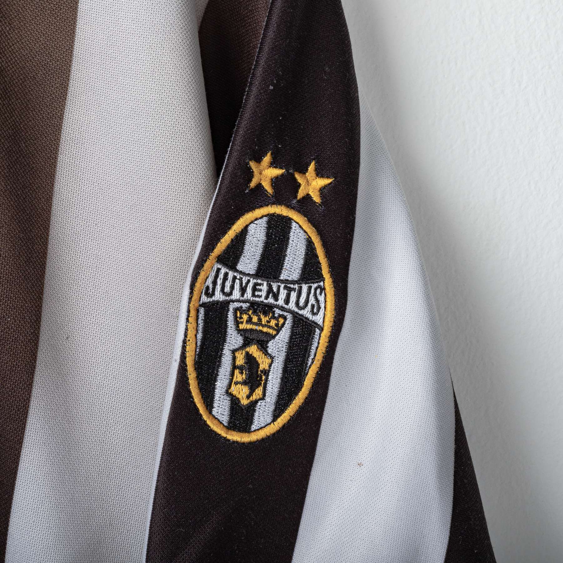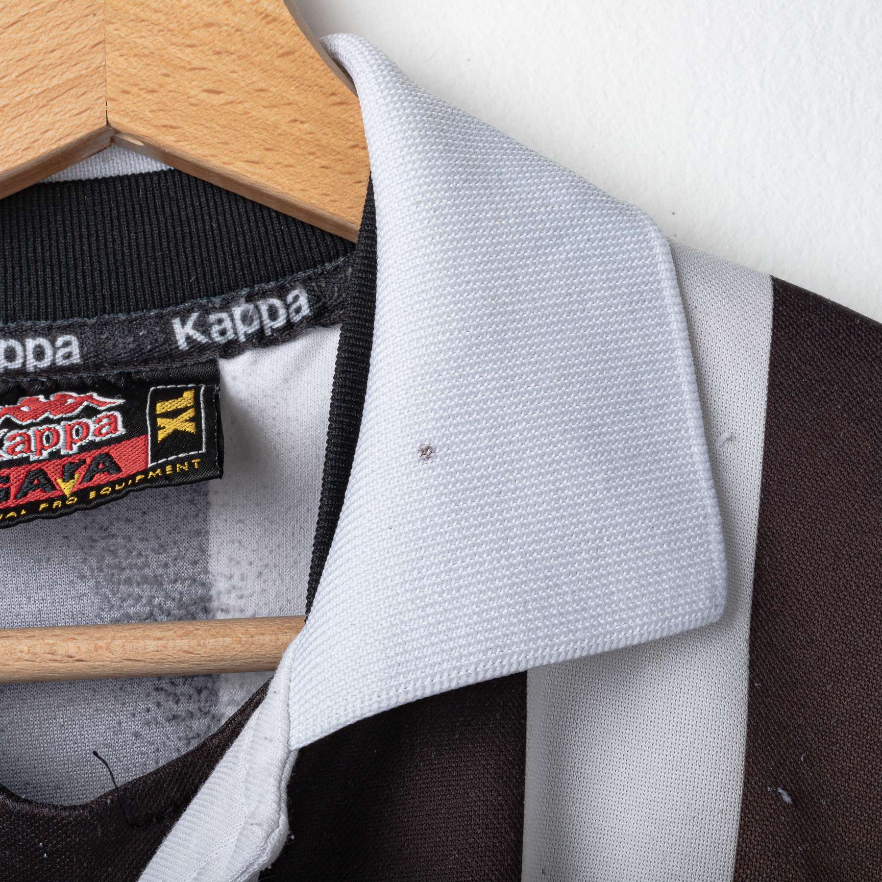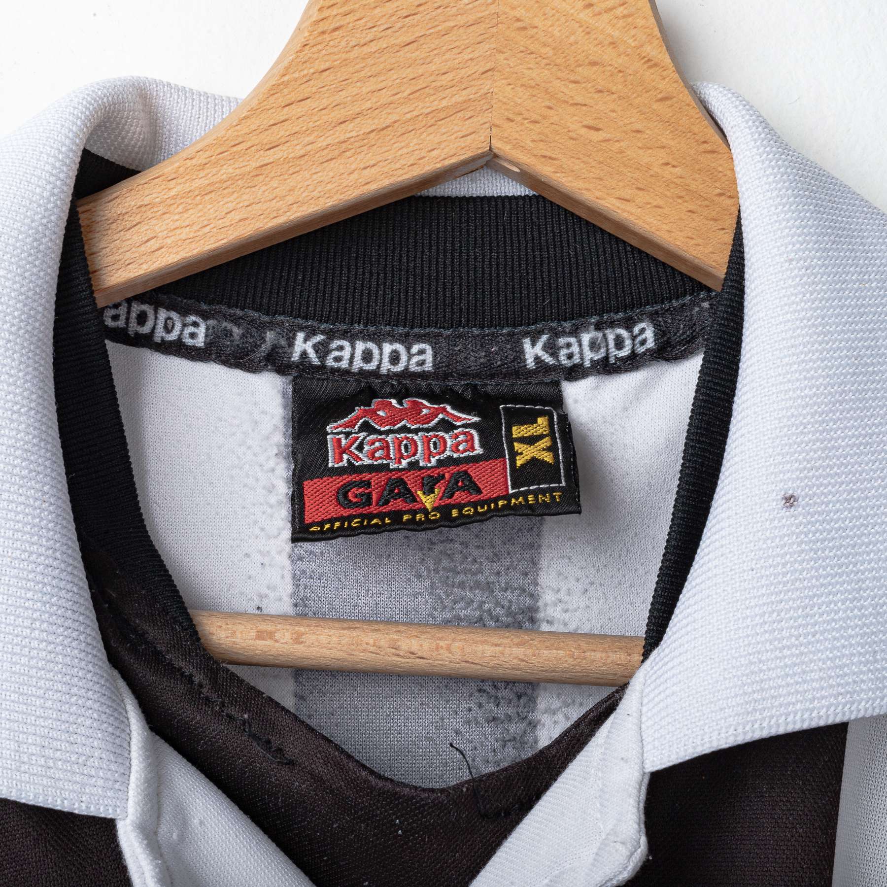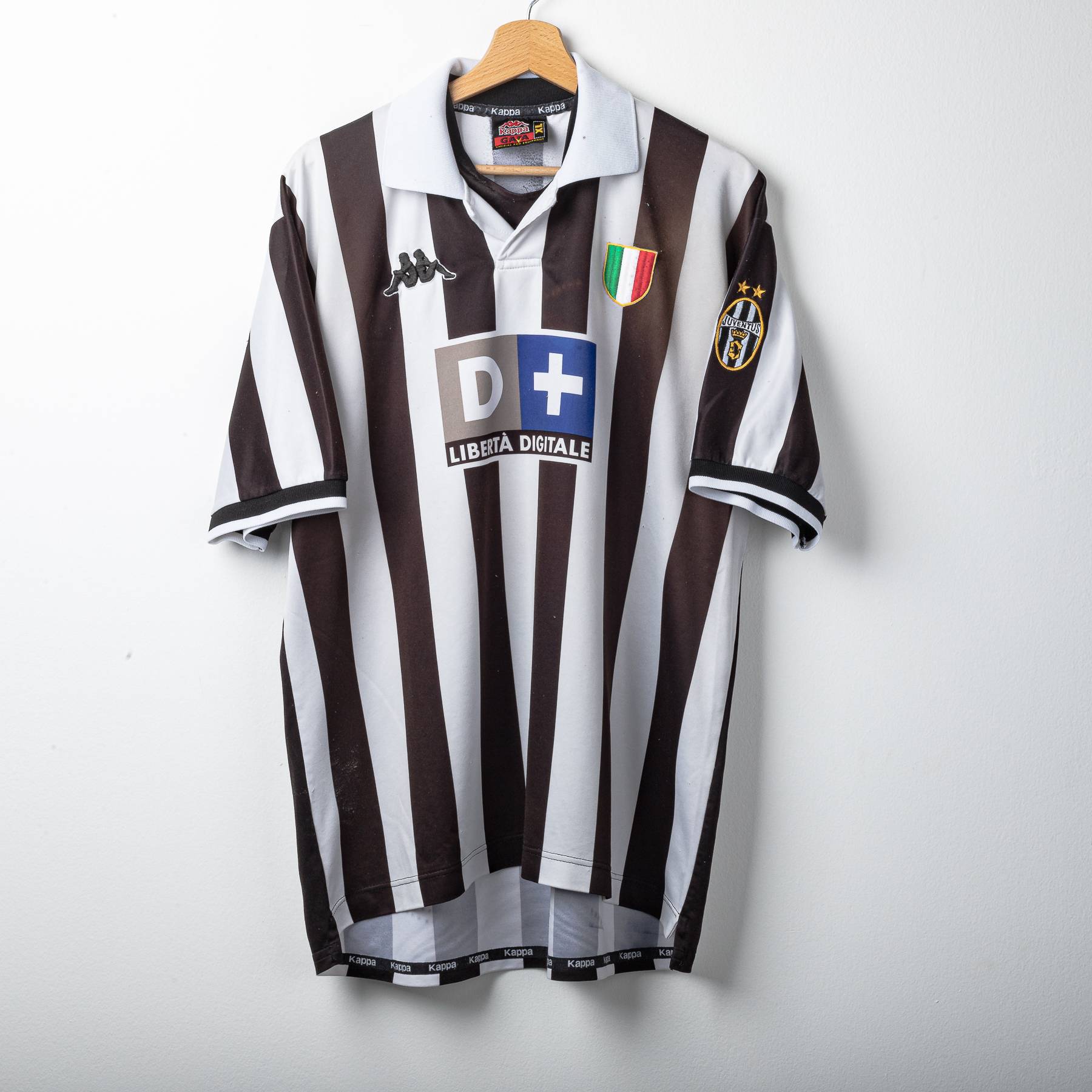 Maglia home della Juventus stagione 1998/1999, realizzata da Kappa. Classico design a righe verticali bianconere con colletto polo bianco e chiusura a V. Stemma Juventus ricamato sulla manica destra con le due stelle dorate, scudetto tricolore sul petto sinistro e logo Kappa nero ricamato sul petto destro. Sponsor centrale D+ Libertà Digitale stampato. Sul retro personalizzazione ufficiale DEL PIERO 10 in rosso. Etichetta Kappa Gara cucita nel colletto e nastratura interna logata. Tessuto tecnico leggero con inserti microforati laterali. Taglia XL, vestibilità regolare. Maglia originale Kappa, prima divisa ufficiale della Juventus 1998/99, stagione di transizione dopo gli anni d’oro e simbolo dell’epoca Del Piero.