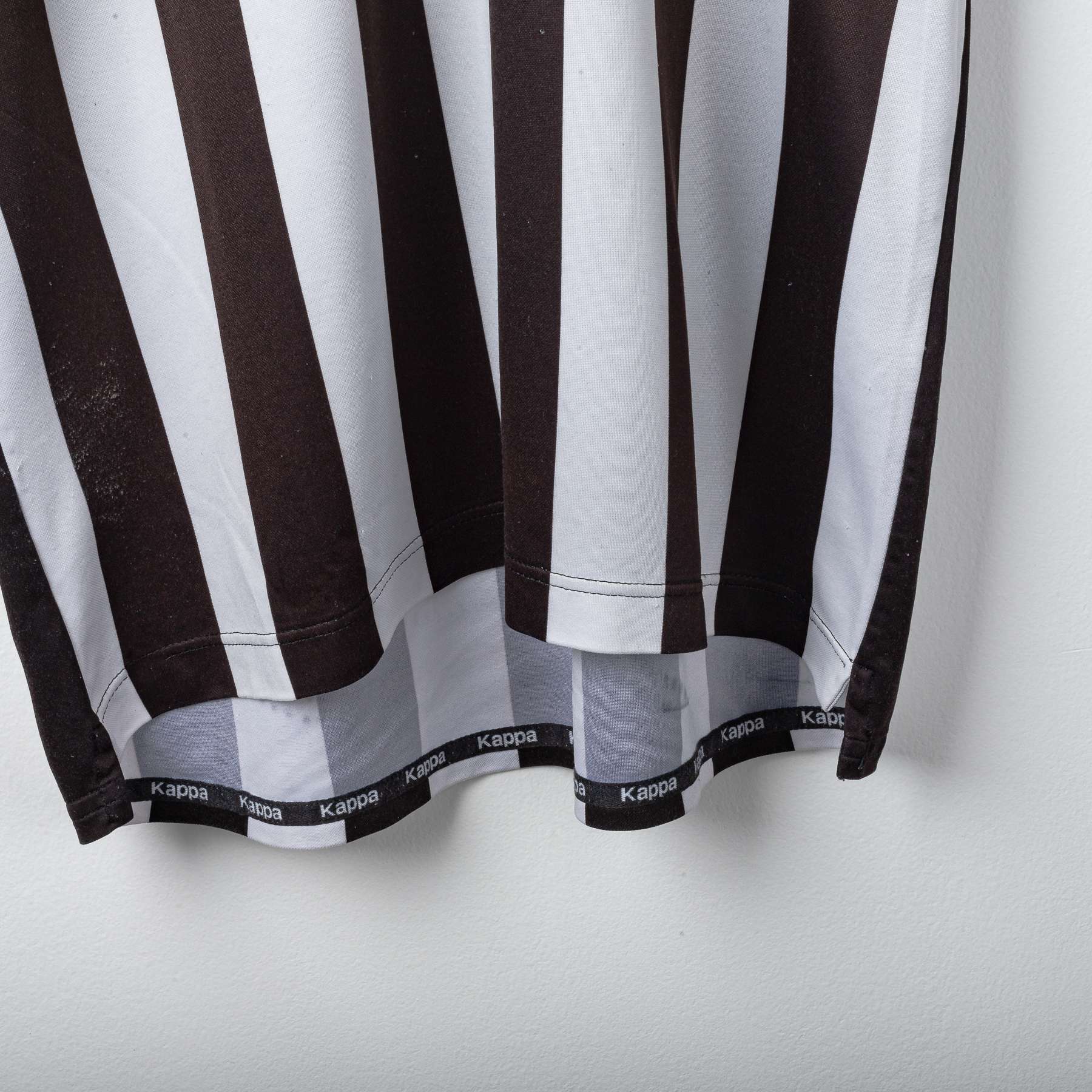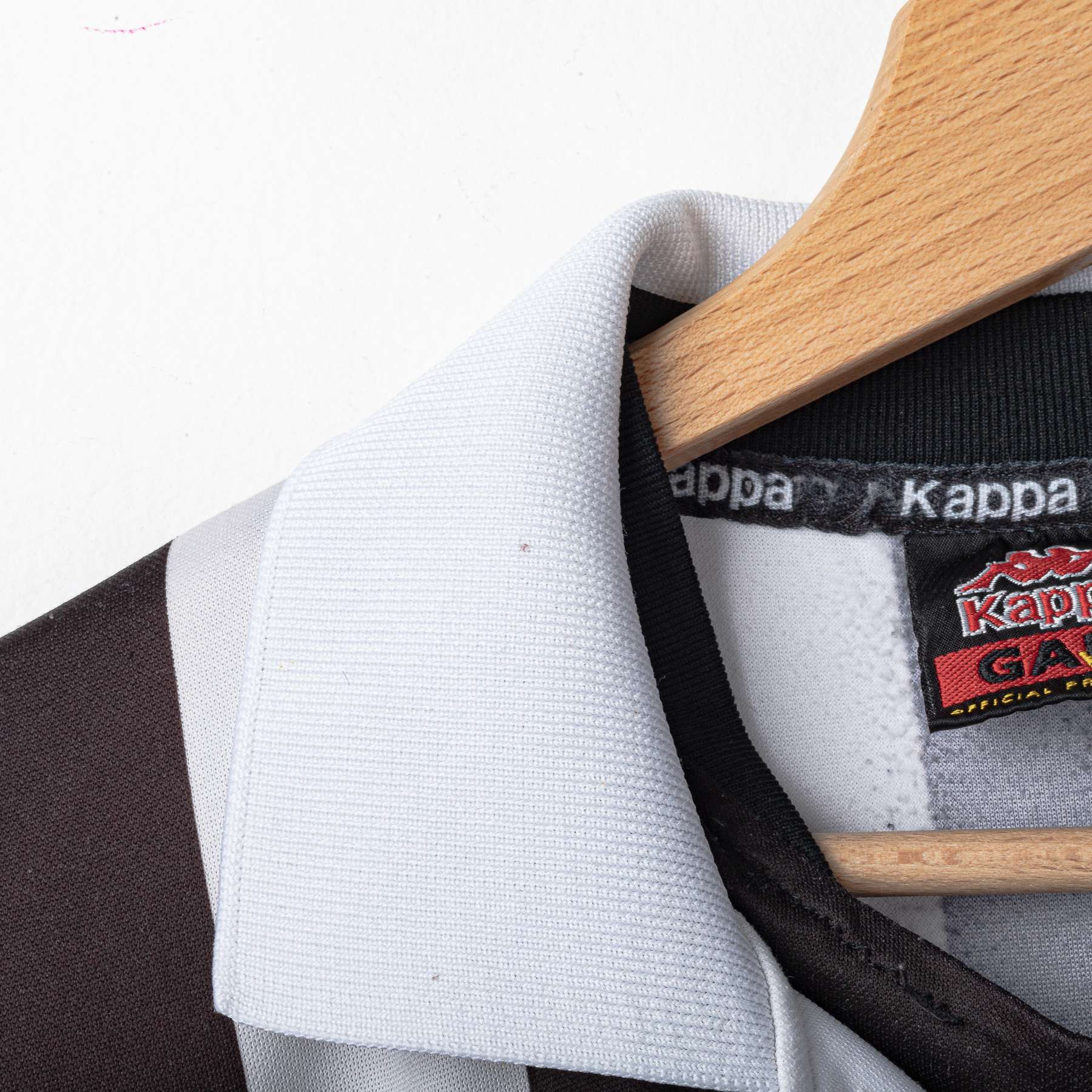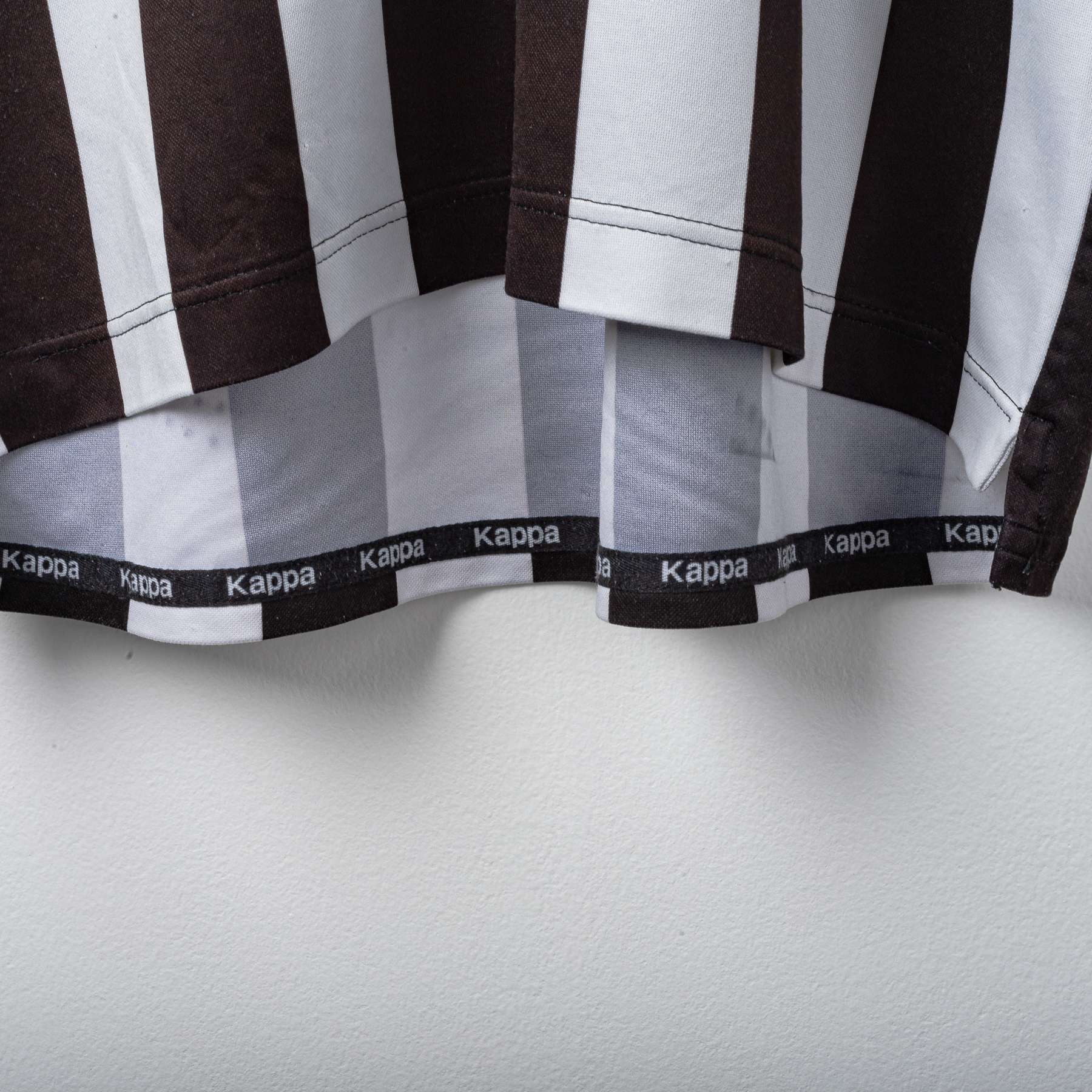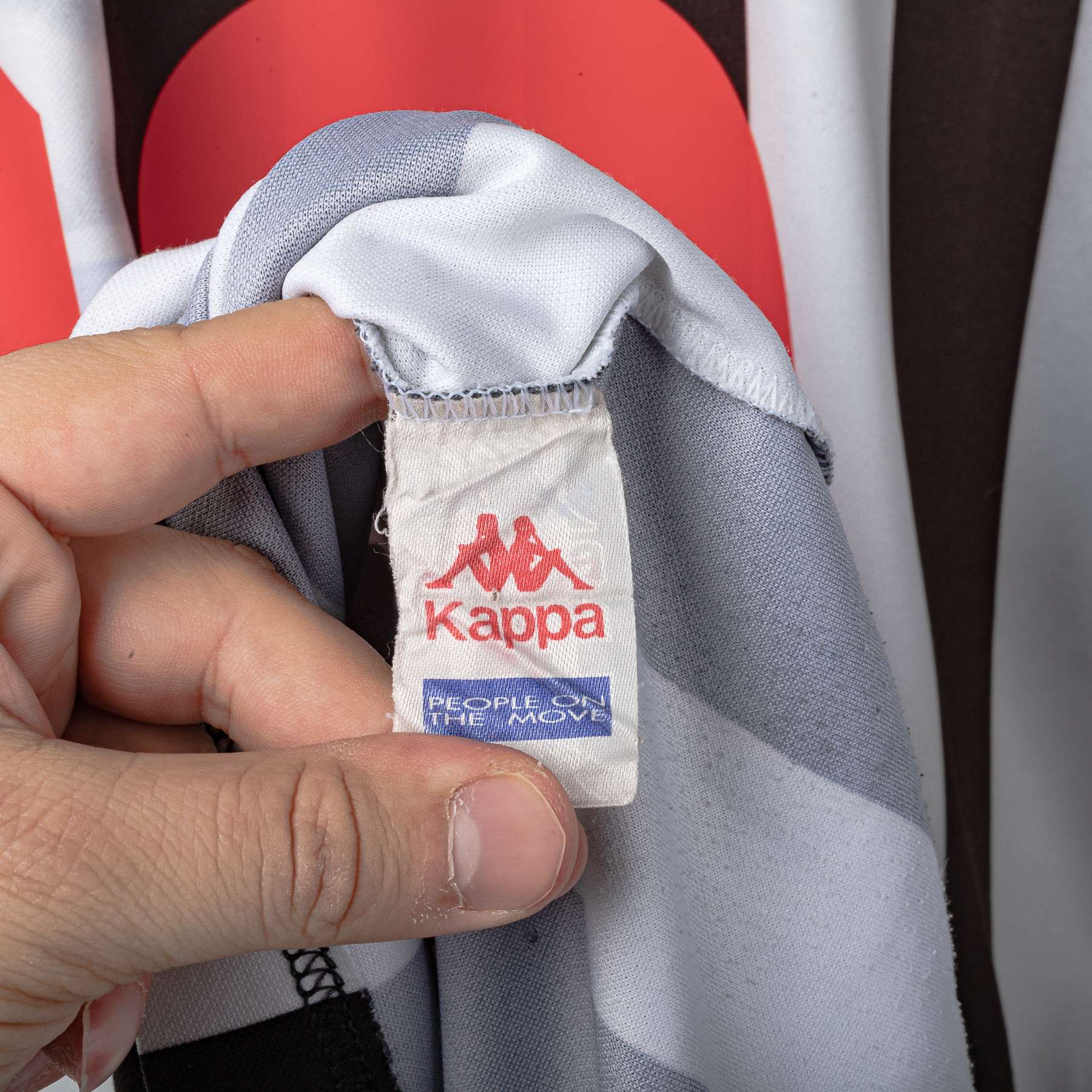 Maglia home della Juventus stagione 1998/1999, realizzata da Kappa. Classico design a righe verticali bianconere con colletto polo bianco e chiusura a V. Stemma Juventus ricamato sulla manica destra con le due stelle dorate, scudetto tricolore sul petto sinistro e logo Kappa nero ricamato sul petto destro. Sponsor centrale D+ Libertà Digitale stampato. Sul retro personalizzazione ufficiale DEL PIERO 10 in rosso. Etichetta Kappa Gara cucita nel colletto e nastratura interna logata. Tessuto tecnico leggero con inserti microforati laterali. Taglia XL, vestibilità regolare. Maglia originale Kappa, prima divisa ufficiale della Juventus 1998/99, stagione di transizione dopo gli anni d’oro e simbolo dell’epoca Del Piero.