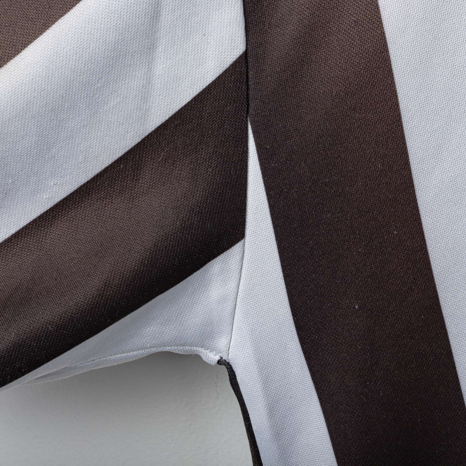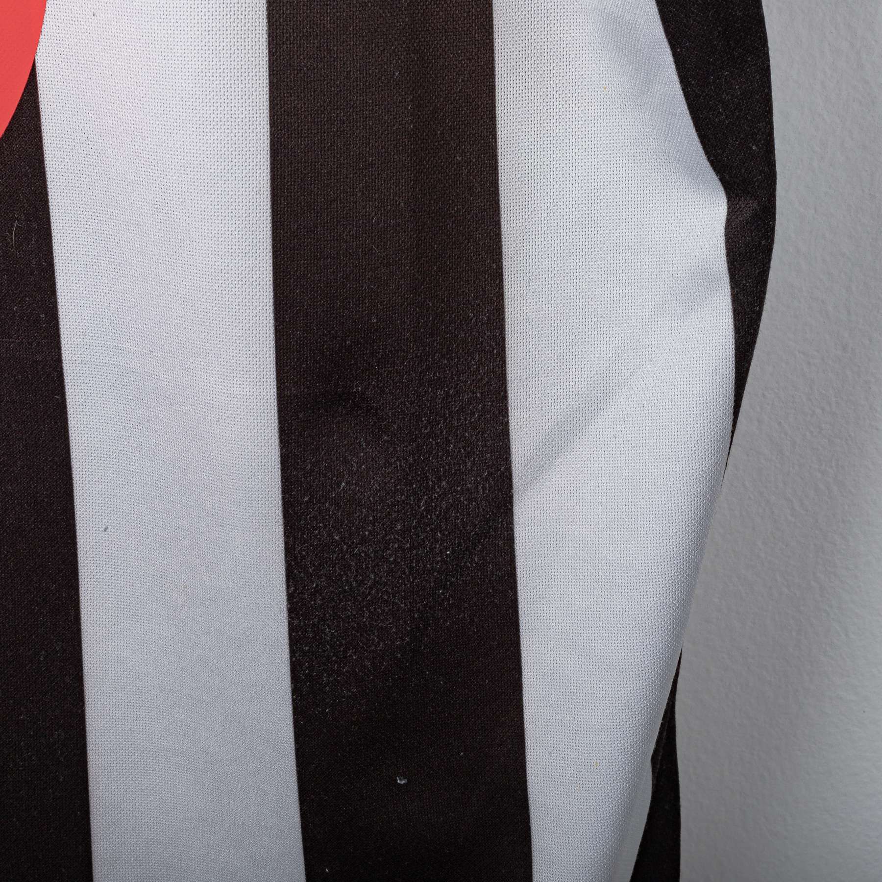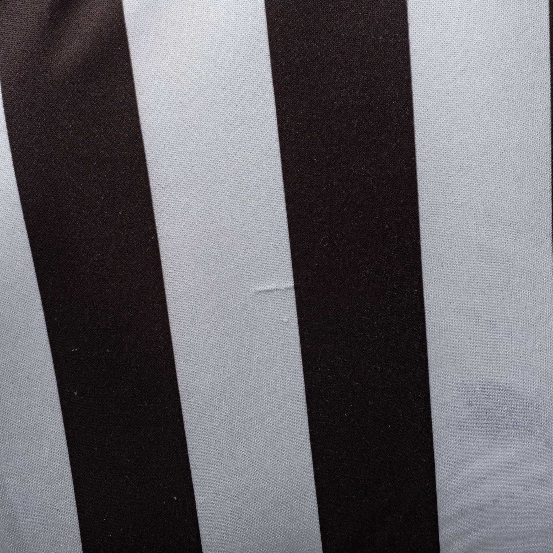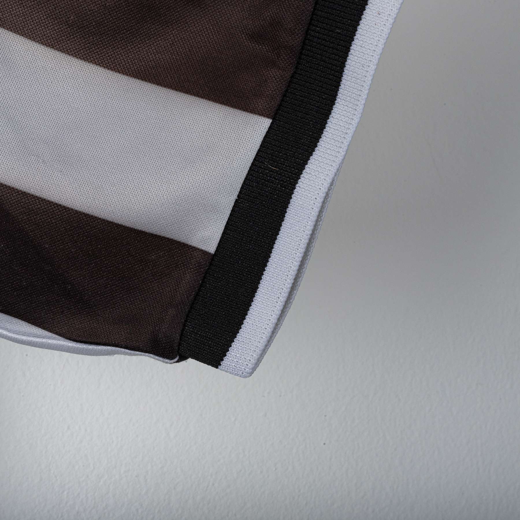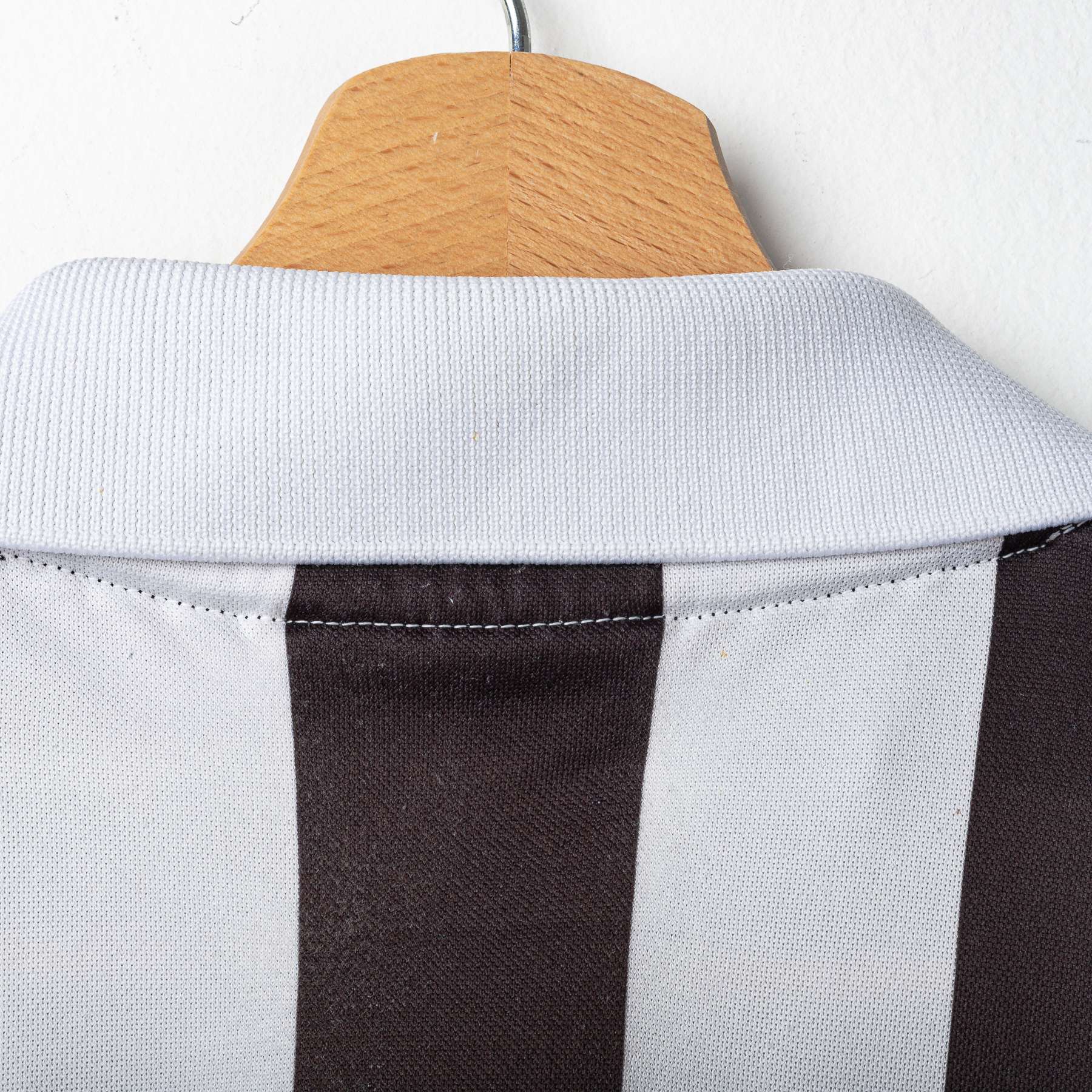 Maglia home della Juventus stagione 1998/1999, realizzata da Kappa. Classico design a righe verticali bianconere con colletto polo bianco e chiusura a V. Stemma Juventus ricamato sulla manica destra con le due stelle dorate, scudetto tricolore sul petto sinistro e logo Kappa nero ricamato sul petto destro. Sponsor centrale D+ Libertà Digitale stampato. Sul retro personalizzazione ufficiale DEL PIERO 10 in rosso. Etichetta Kappa Gara cucita nel colletto e nastratura interna logata. Tessuto tecnico leggero con inserti microforati laterali. Taglia XL, vestibilità regolare. Maglia originale Kappa, prima divisa ufficiale della Juventus 1998/99, stagione di transizione dopo gli anni d’oro e simbolo dell’epoca Del Piero.