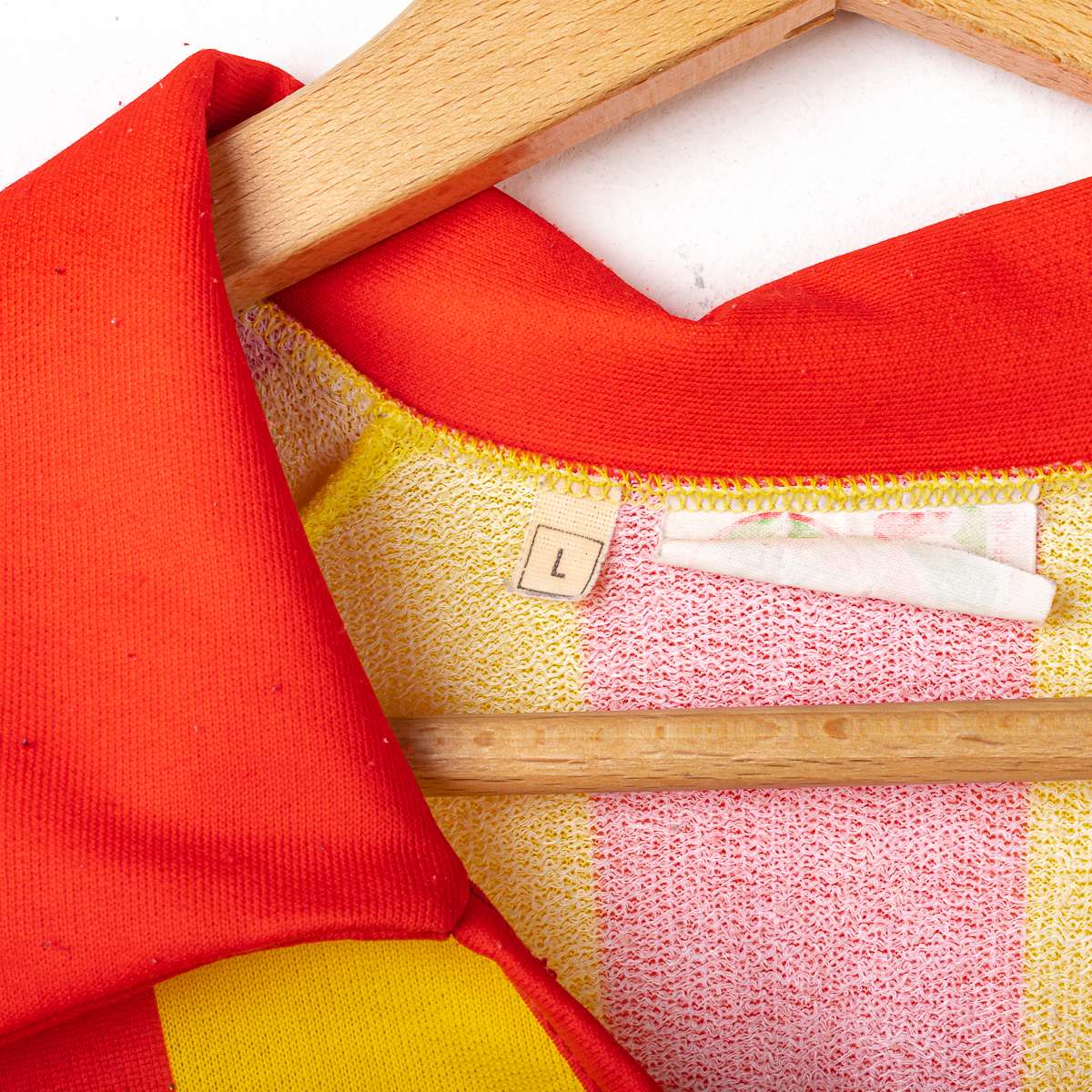 US Lecce long-sleeved home jersey, 1990/1991 season, made by Adidas. Yellow and red vertical striped design with a red polo collar and three Adidas stripes down the sleeves. The Adidas logo and Lecce crest are sublimated on the chest; the Dreher sponsor is sublimated on a white panel in the center. Red cuffs. Internal label with 100% polyester composition and Made in Italy markings; size L. Condition as per photo.
