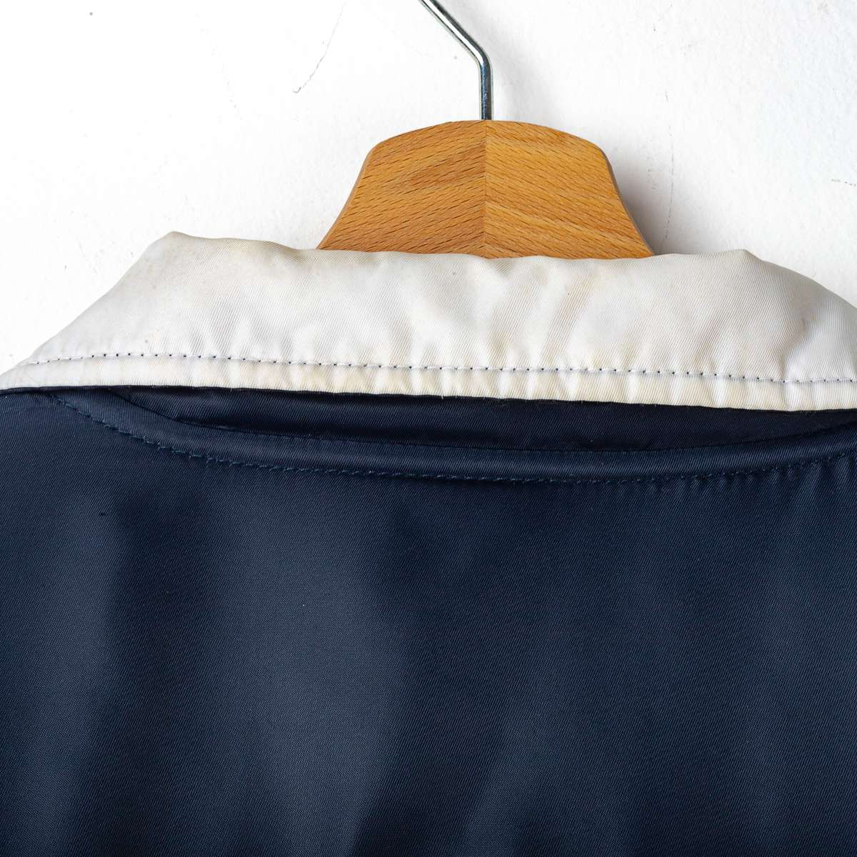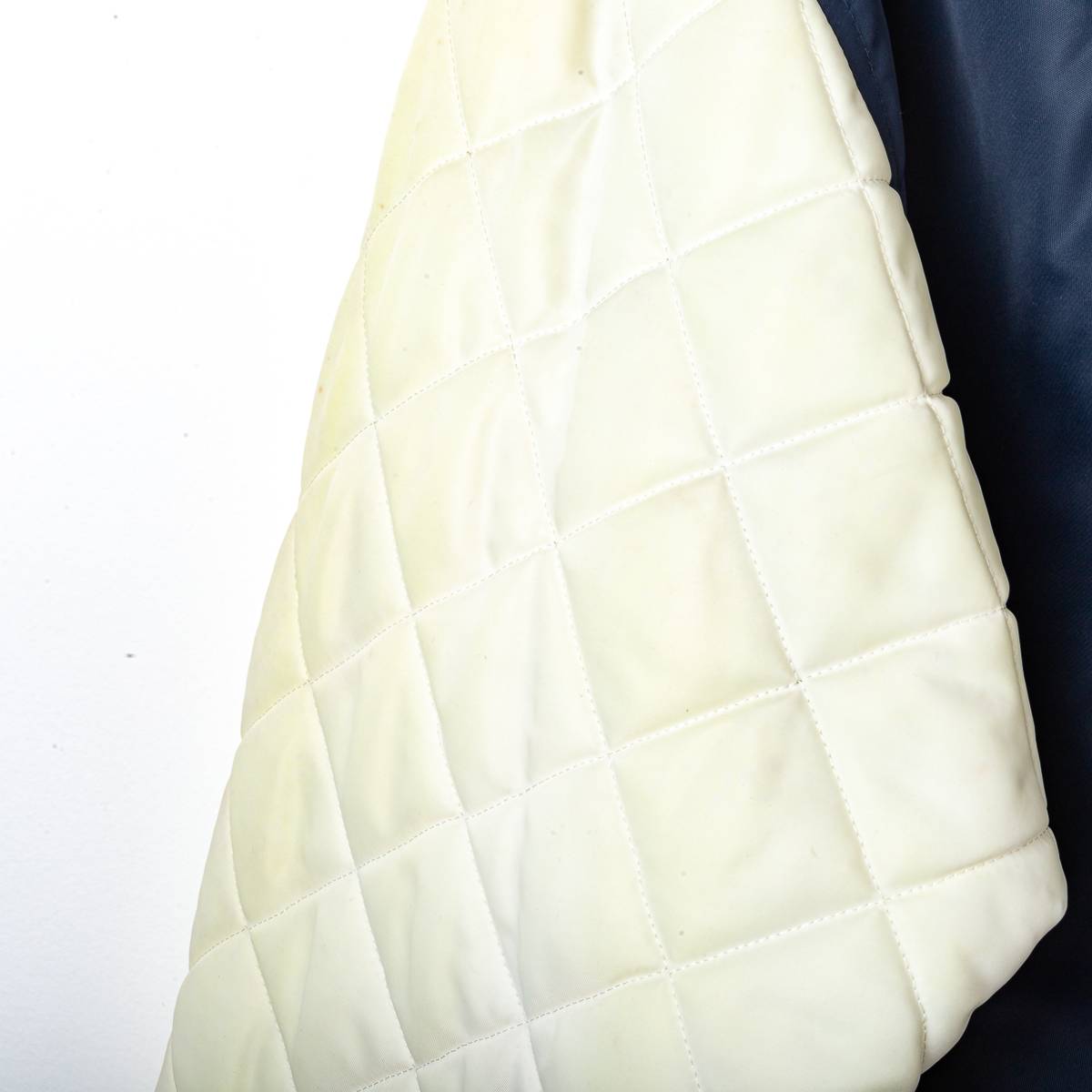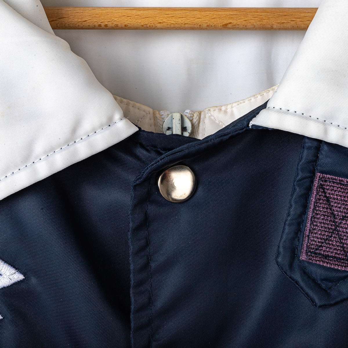 Official SSC Napoli college jacket from the 1994/1995 season, produced by Lotto. Iconic navy blue varsity-style model with ivory-colored padded sleeves and diamond quilting. Front closure with metal snaps. Lotto logo embroidered on the chest, SSC Napoli crest sewn on the left chest. “Record Cucine” sponsor applied on the front in a printed diamond graphic detail, also echoed by the large back logo with “SSC Napoli Lotto” writing and a “7N” diamond. Lined interior. Original Lotto interior label.