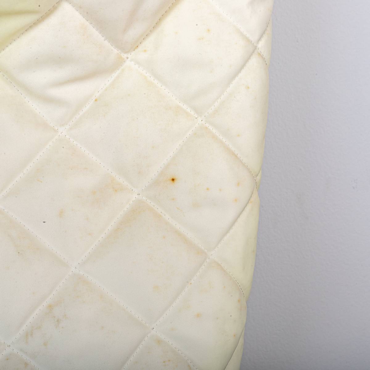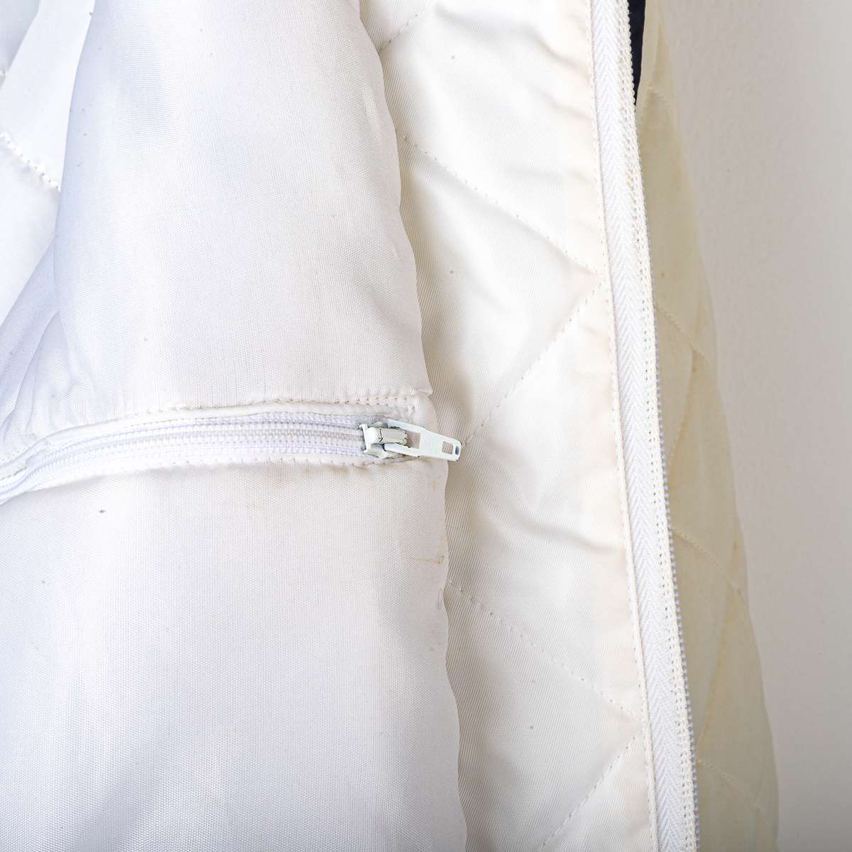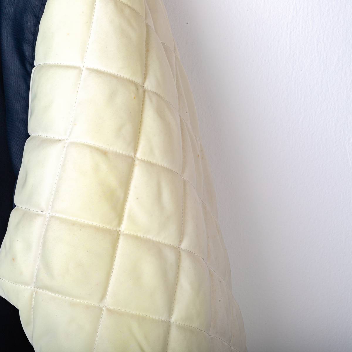 Official SSC Napoli college jacket from the 1994/1995 season, produced by Lotto. Iconic navy blue varsity-style model with ivory-colored padded sleeves and diamond quilting. Front closure with metal snaps. Lotto logo embroidered on the chest, SSC Napoli crest sewn on the left chest. “Record Cucine” sponsor applied on the front in a printed diamond graphic detail, also echoed by the large back logo with “SSC Napoli Lotto” writing and a “7N” diamond. Lined interior. Original Lotto interior label.