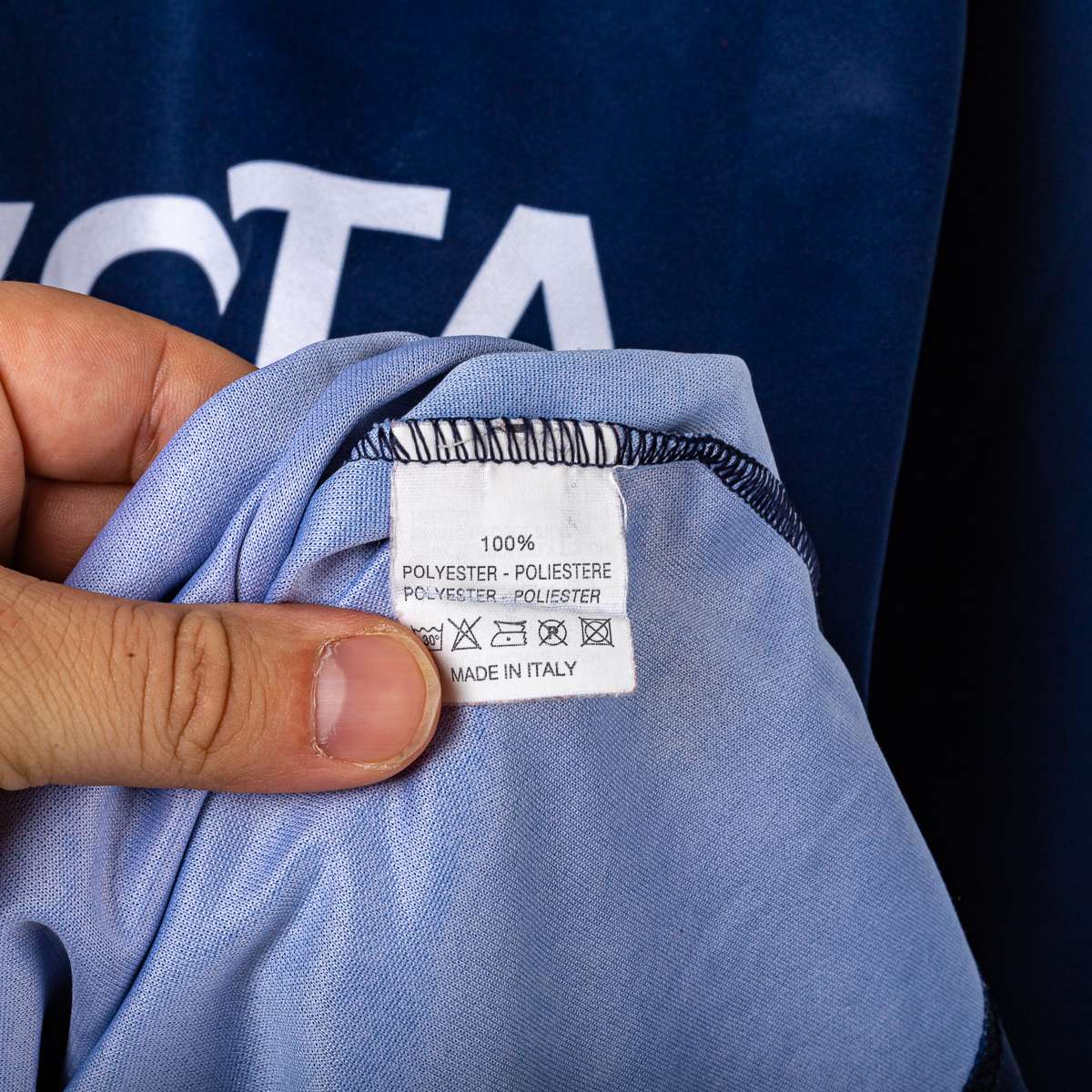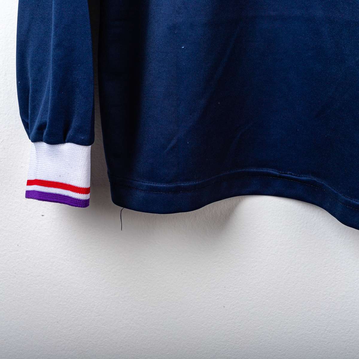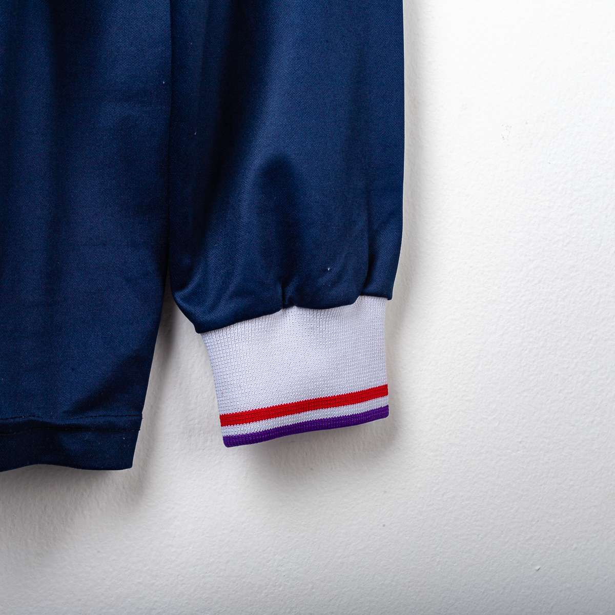 ACF Fiorentina training jersey from the 2001/2002 season, produced by Mizuno. Long-sleeved model made of 100% polyester technical fabric in navy blue, lightweight and breathable, designed for training. Crew neck with contrasting white, red, and purple trim; matching elastic cuffs. Mizuno logo printed on the right chest and repeated on the sleeves. ACF Fiorentina logo sewn on the left chest. Toyota sponsor printed centrally on the front and back. Regular fit, 2000s-style, clean and minimalist design typical of training apparel of the time. Internal label with details of the composition and production. Made in Italy.