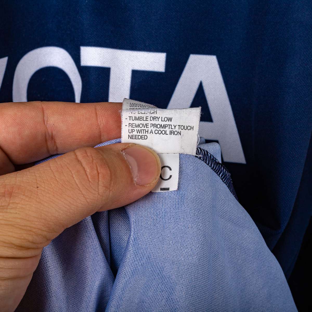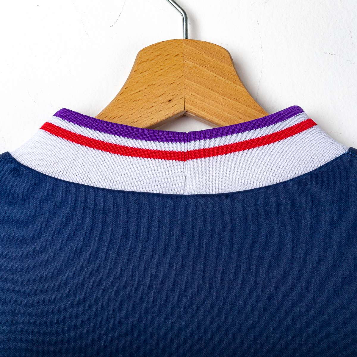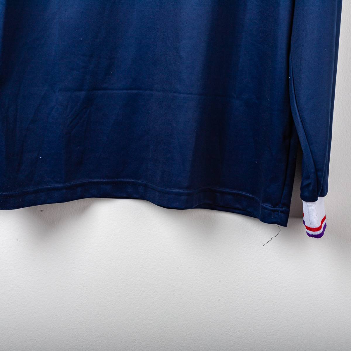 ACF Fiorentina training jersey from the 2001/2002 season, produced by Mizuno. Long-sleeved model made of 100% polyester technical fabric in navy blue, lightweight and breathable, designed for training. Crew neck with contrasting white, red, and purple trim; matching elastic cuffs. Mizuno logo printed on the right chest and repeated on the sleeves. ACF Fiorentina logo sewn on the left chest. Toyota sponsor printed centrally on the front and back. Regular fit, 2000s-style, clean and minimalist design typical of training apparel of the time. Internal label with details of the composition and production. Made in Italy.