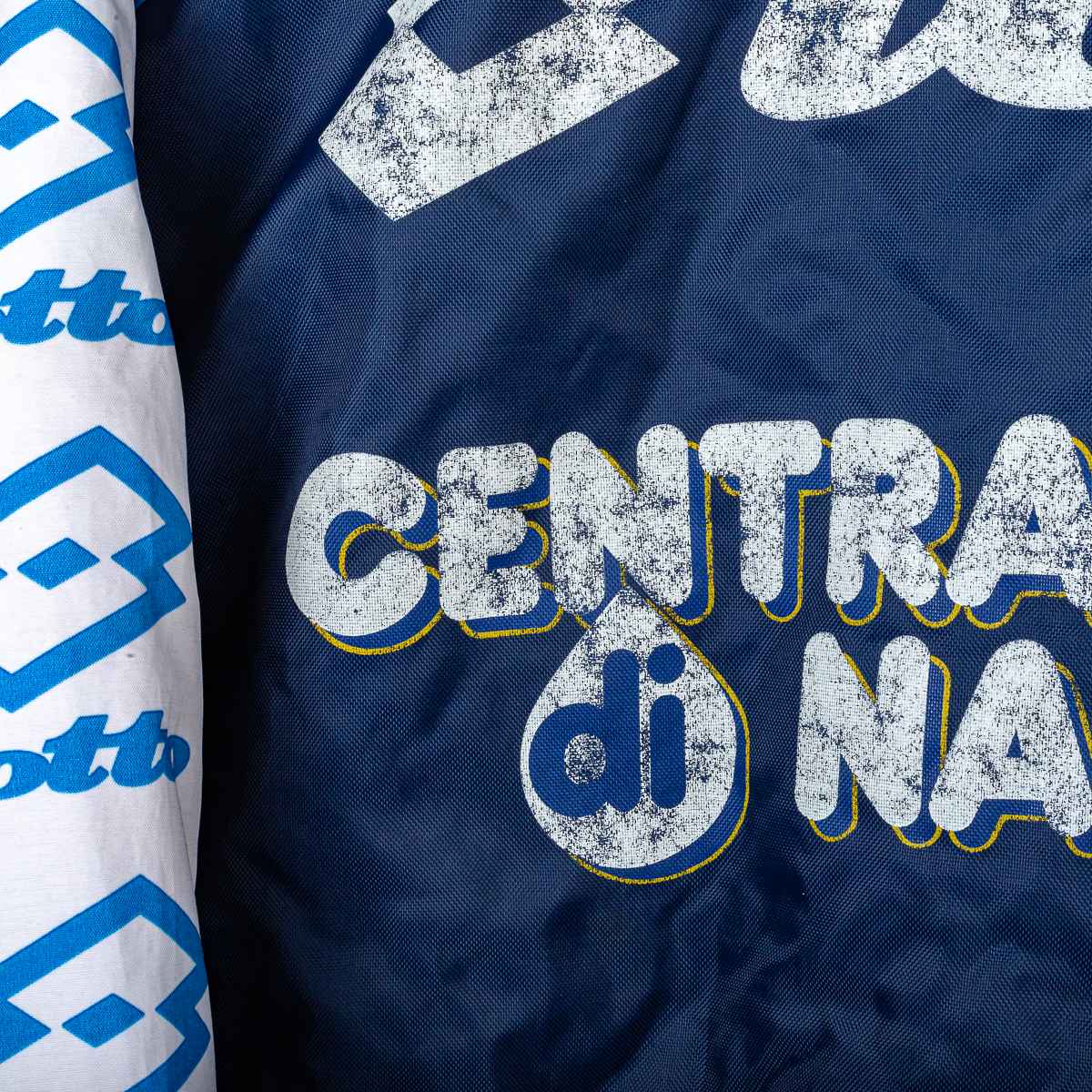 Official SSC Napoli jacket from the 1996/1997 season, produced by Lotto. This padded winter jacket is made of 100% polyester technical fabric, featuring a navy blue exterior and light blue and white inserts on the sleeves. High collar with a front zip and snap button closure and drawstring hem. Lotto logo embroidered on the right chest, SSC Napoli crest sewn onto the left chest, and Centrale del Latte di Napoli sponsor embroidered on the front and printed in large format on the back. Sleeves decorated with a repeated Lotto logo band. Quilted interior with padded lining for added thermal insulation. Lotto internal label indicating size M and Made in Italy production.