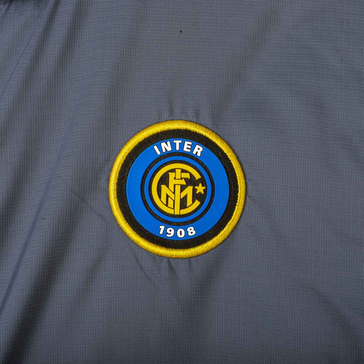 Gray jacket from the 2001/2002 football season. Made by Nike in the padded version. Inter Milan logo embroidered on the circular version. Nike logo embroidered in white. Size M. Made in India.