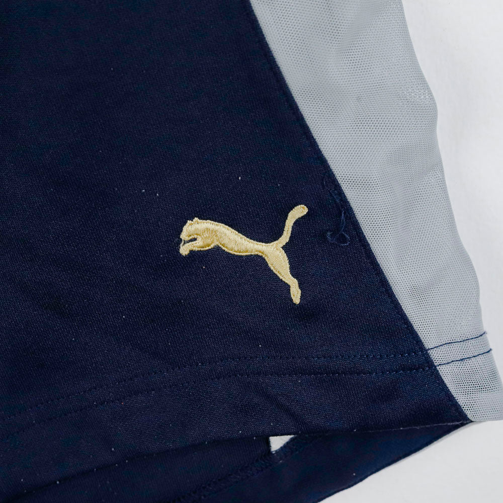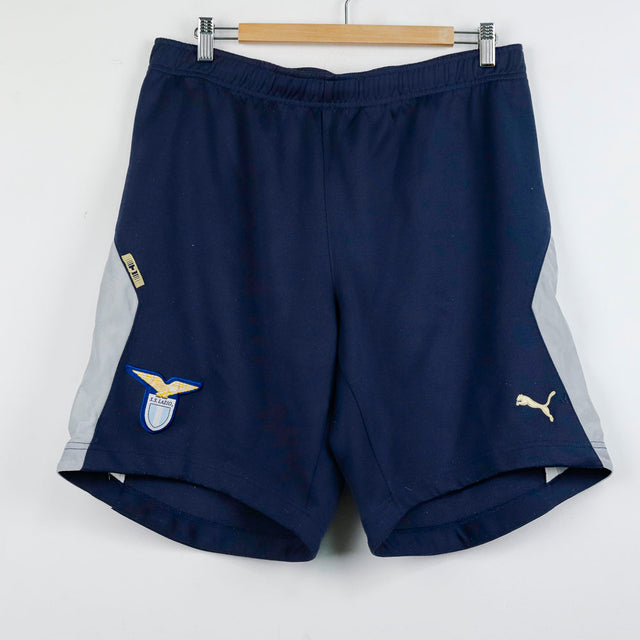 Bermuda da allenamento della S.S. Lazio prodotti da Puma e riconducibili alla stagione 2007/2008, periodo in cui il marchio tedesco era sponsor tecnico del club biancoceleste. L’etichetta interna riporta la taglia XL con produzione in Malesia.