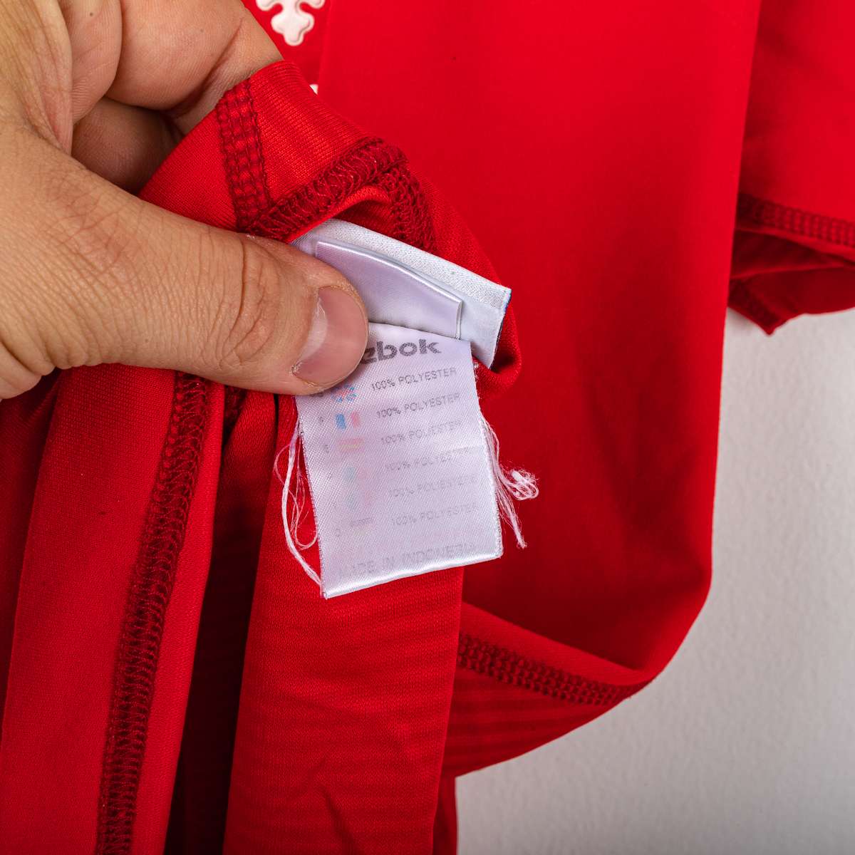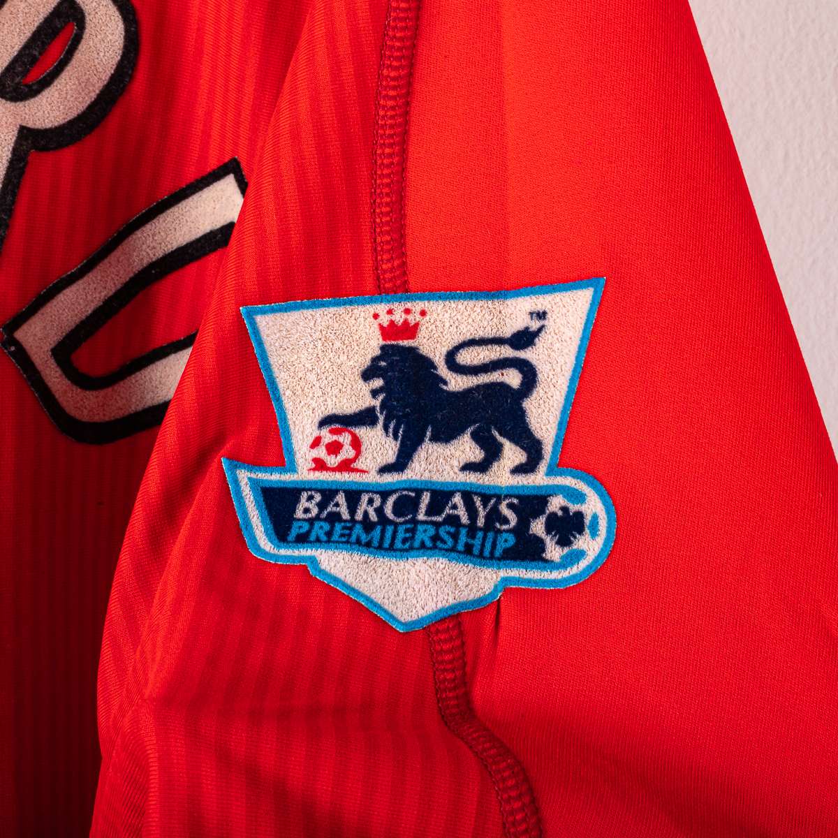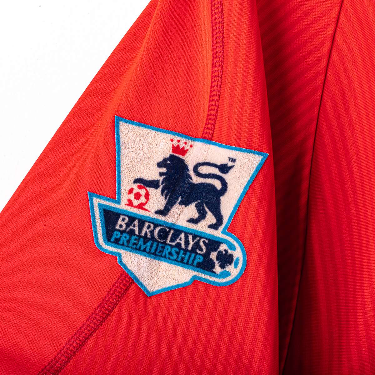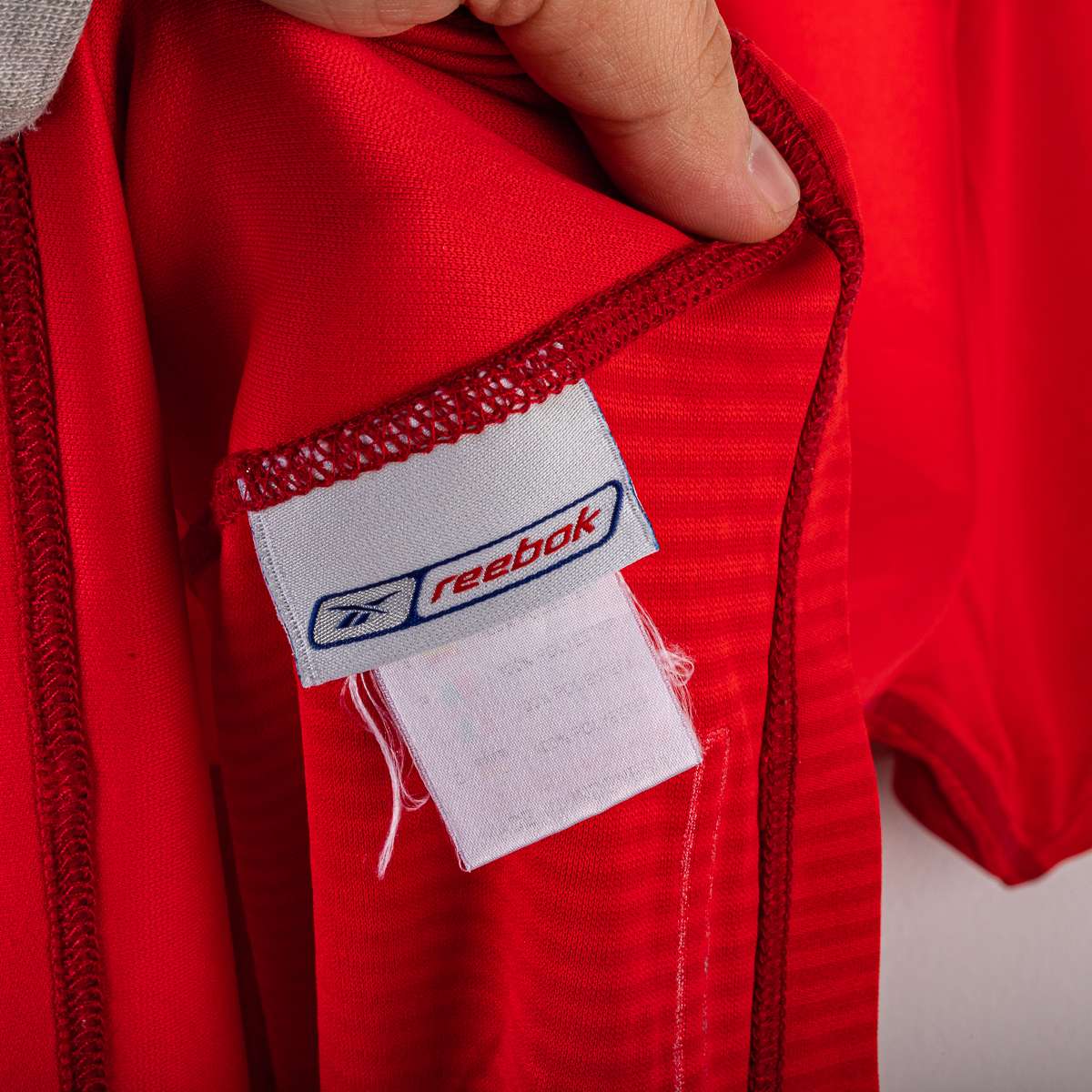 Liverpool FC home shirt from the 2002/2003 season, produced by Reebok. V-neck with double white and red insert, a distinctive detail of the model. Reebok logo applied on the chest, official Liverpool FC crest in flock at the center. "Carlsberg" sponsor applied in white flock print on the front. Official Barclays Premiership patches are applied on the sleeves. On the back, the name "Gerrard" and the number 8 are applied in white flock with a black outline, with the Premier League logo at the base of the number. Original Reebok inner label, size L.