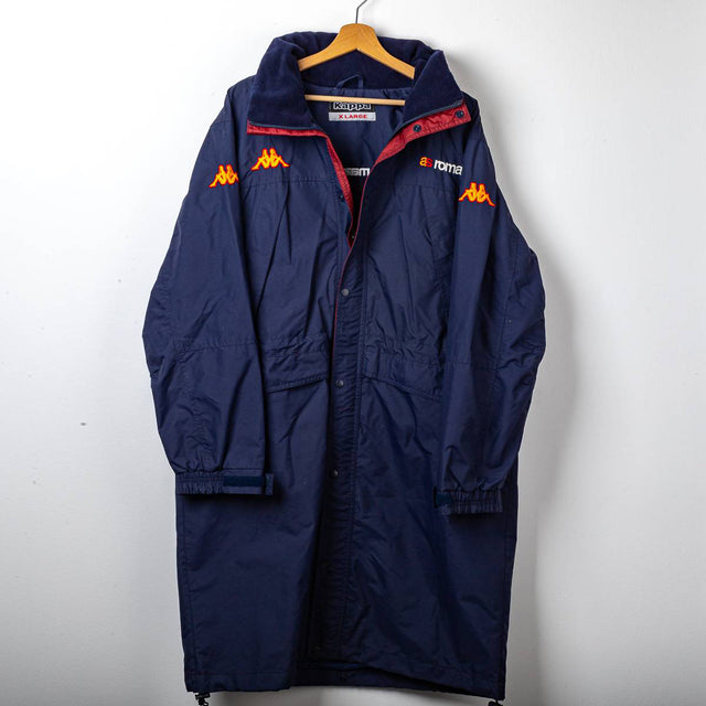 Official AS Roma bench jacket from the 2004/2005 season, produced by Kappa. This long, padded jacket, designed for the coaching staff and bench, is made from 100% polyester technical fabric in navy blue with a warm, insulating interior. It features a front zip and snap button closure, a high collar with fleece lining, and an integrated hood. The Kappa logo is embroidered on the sleeves and chest, with AS Roma lettering embroidered on the left chest. The Mazda logo is embroidered at the top center of the back, along with the AS Roma crest. Adjustable drawstring hem and elastic cuffs. Loose fit, typical of the early 2000s, with a long bench silhouette. Inside Kappa label with size XL.