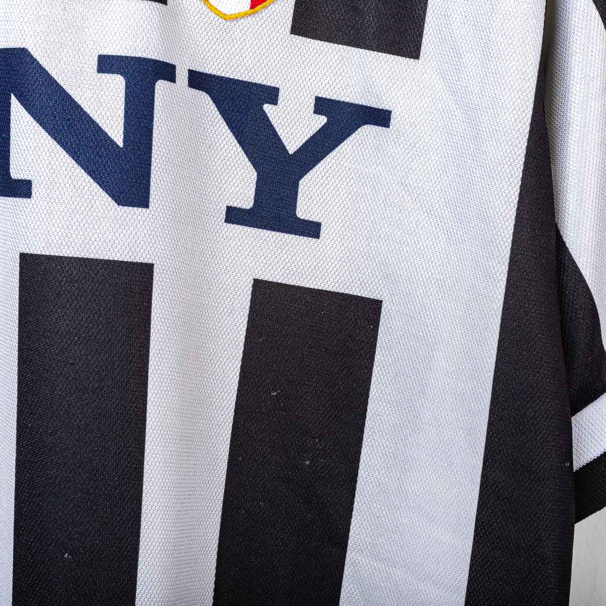 Juventus FC home jersey from the 1995/1996 season, produced by Kappa. V-neck polo collar with knitted trim, a distinctive detail of Juventus jerseys from the mid-1990s. Kappa logo embroidered on the right chest, with a circular tricolor patch underneath, recalling the Italian Champion title. Juventus crest embroidered on the left chest, surmounted by two commemorative gold stars. "SONY" sponsor applique centrally. Regular fit, authentic 1990s cut. Kappa Gara label inside with "Made in Italy" written on the front. 100% polyester. Size L.