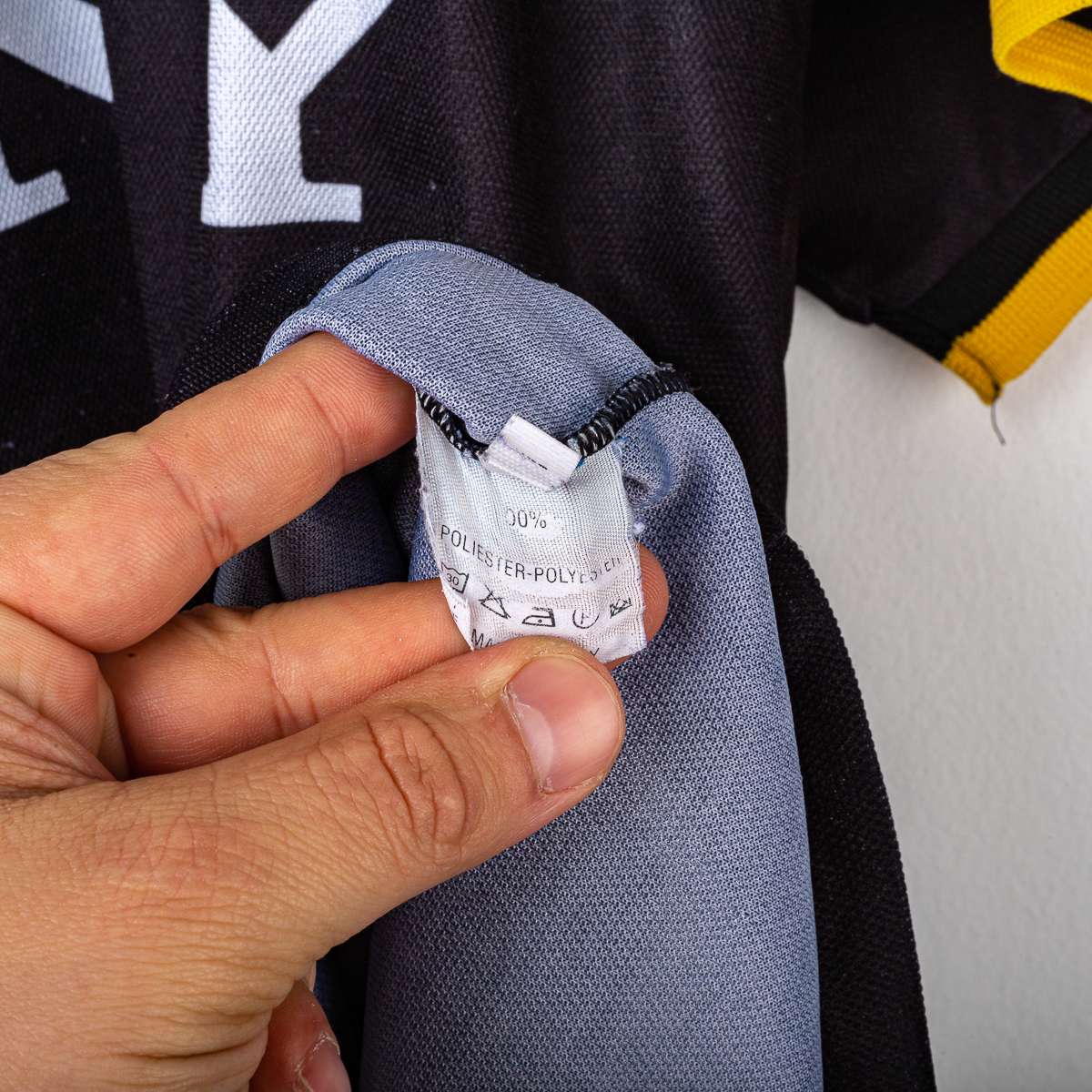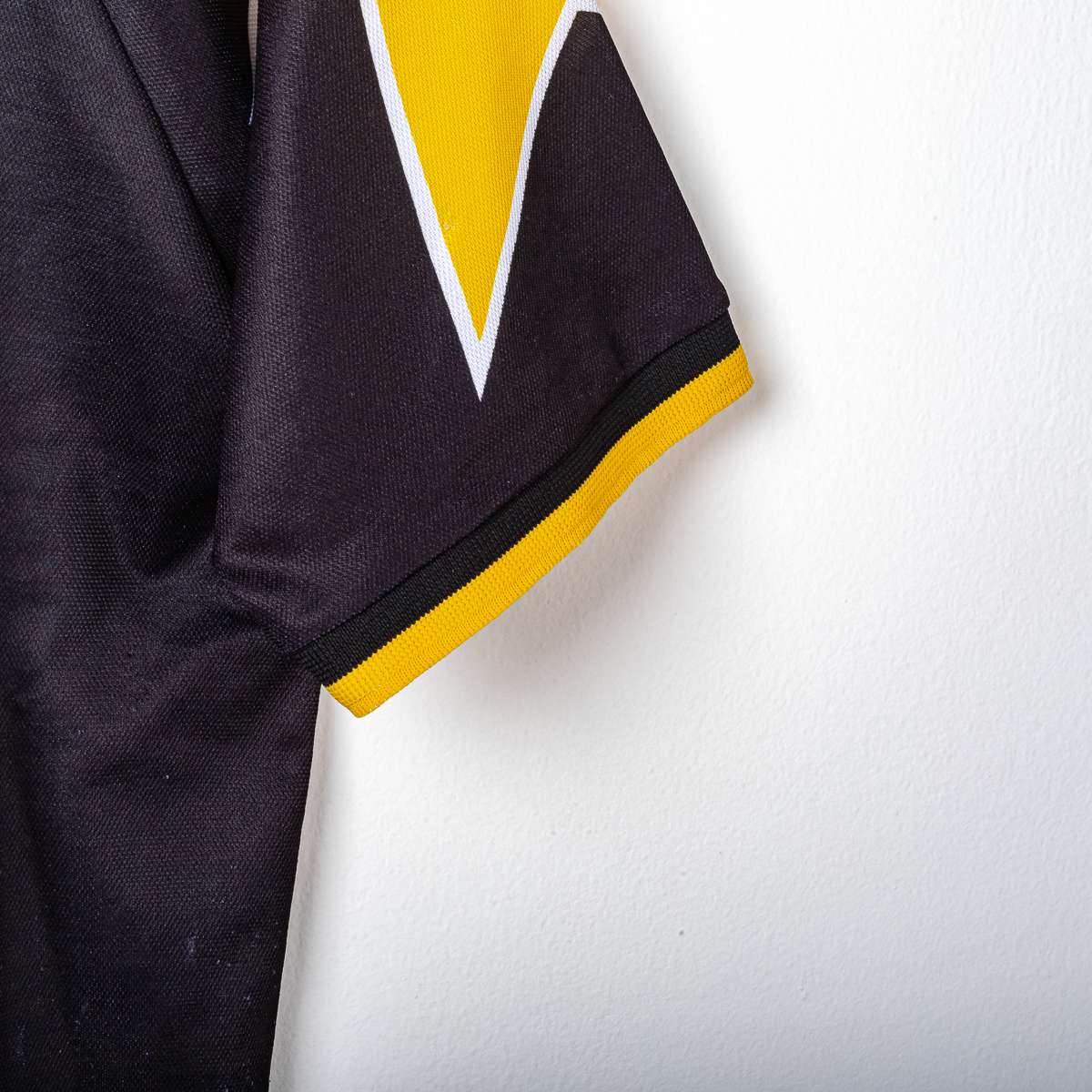 Juventus third jersey from the 1995/1996 season, produced by Kappa. Iconic design on a black base with yellow geometric inserts and white details. V-neck polo collar finished in black and yellow knit. Kappa logo embroidered on the chest, oval Juventus crest with double gold star stitching, symbolizing the club's domestic successes. Central printed "SONY" sponsor, a distinctive element of the era. Original Kappa inside label. Size S.