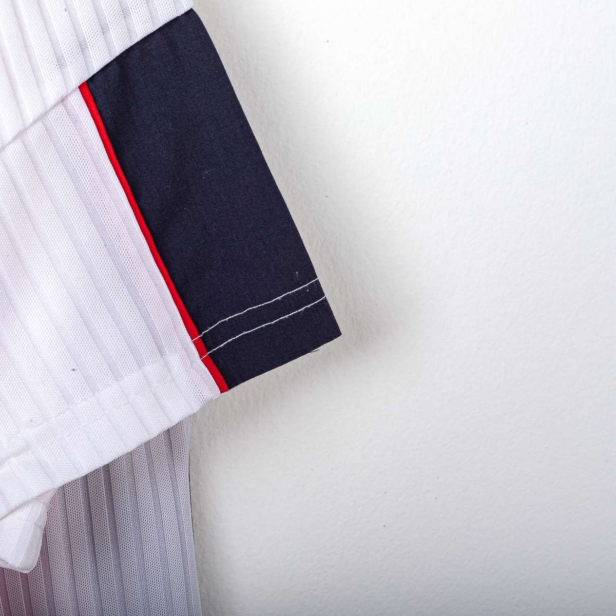 England national team home shirt from the 1998 season, produced by Umbro. White base with tone-on-tone vertical stripes, red and navy blue side panels, and matching sleeve inserts. Navy blue polo collar with button closure and red internal detail, St. George's flag patch applied under the collar. Umbro logo embroidered on the chest and England crest embroidered in the center. Red number 4 with black border on the front, matching Ince name and number 4 on the back. Umbro Official Licensed Product patch with Vapa Tech technology applied at the bottom. Umbro internal label with size M.