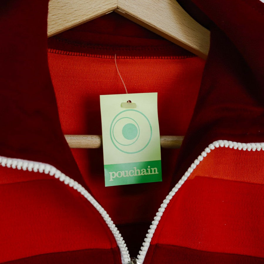 The full zip model is red with yellow details, featuring the Pouchain logo embroidered on the chest.