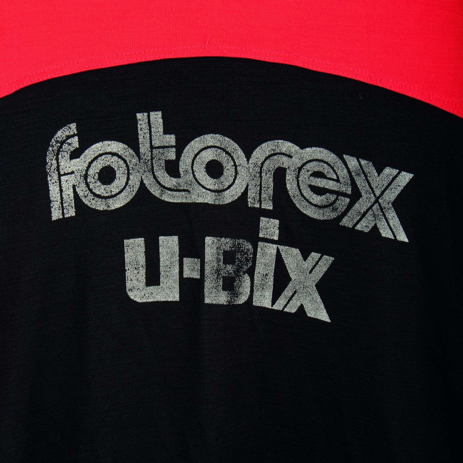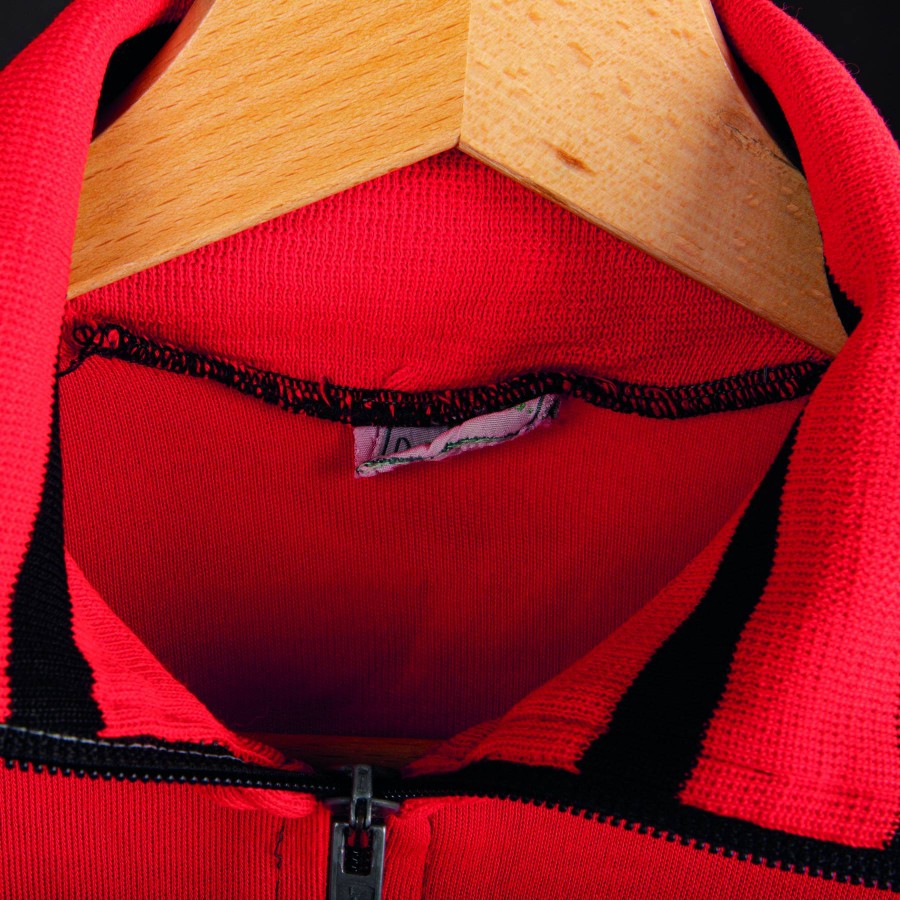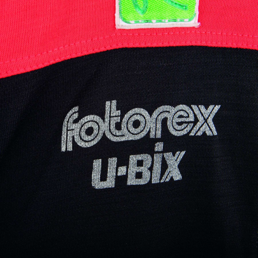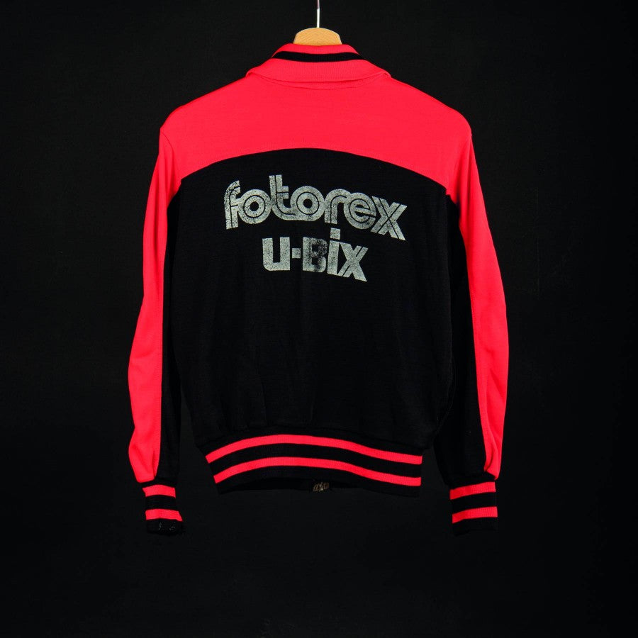 Red and black model with long sleeves, full zip with zip and side pockets with zip. On the heart side we find the MILAN lettering, on the right the Gianni Rivera logo with the commercial sponsor Fotorex U-Bix, repeated in a larger format on the back.
