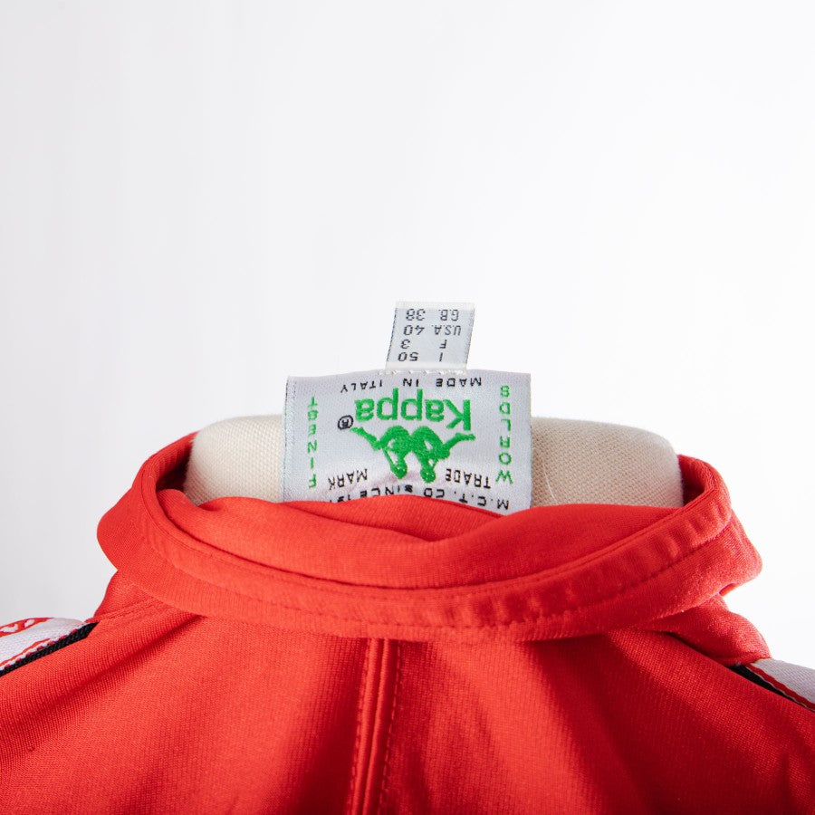 Milan sweatshirt 1988/1989 season. Gray model with red and black details and half-zip opening. Present is an arm to arm band with Kappa logos. The commercial sponsor is Mediolanum.