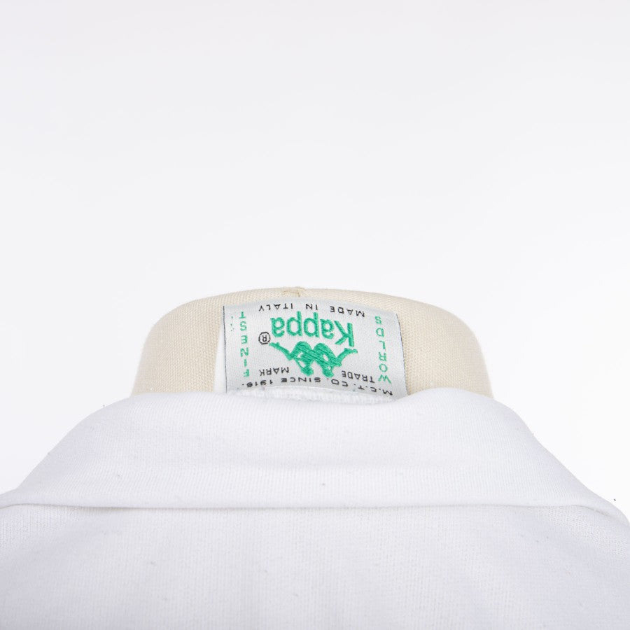 The state of the product is clearly visible from the photos relating to it. The shirt has long sleeves, with a stand-up collar, and is mainly characterized by the white colour; as regards the frontal section, on the right side two white and blue stripes run vertically, interspersed with two other smaller red and black stripes; the logo of the technical sponsor Kappa is embroidered at the top right, while the tricolor headband for those who win the Coppa Italia is sewn on the opposite side; below extends horizontally the large wording painted in blue ERG, the commercial sponsor; even further down there is a small white shield with blue edges, but in sublimation, inside which is placed a red cross; finally, on the left sleeve we find, still in sublimation, the logo of the Genoese club.