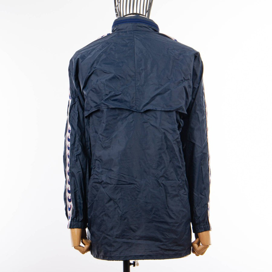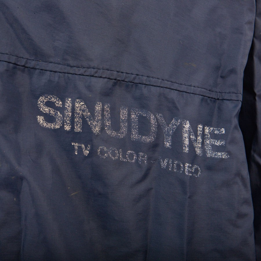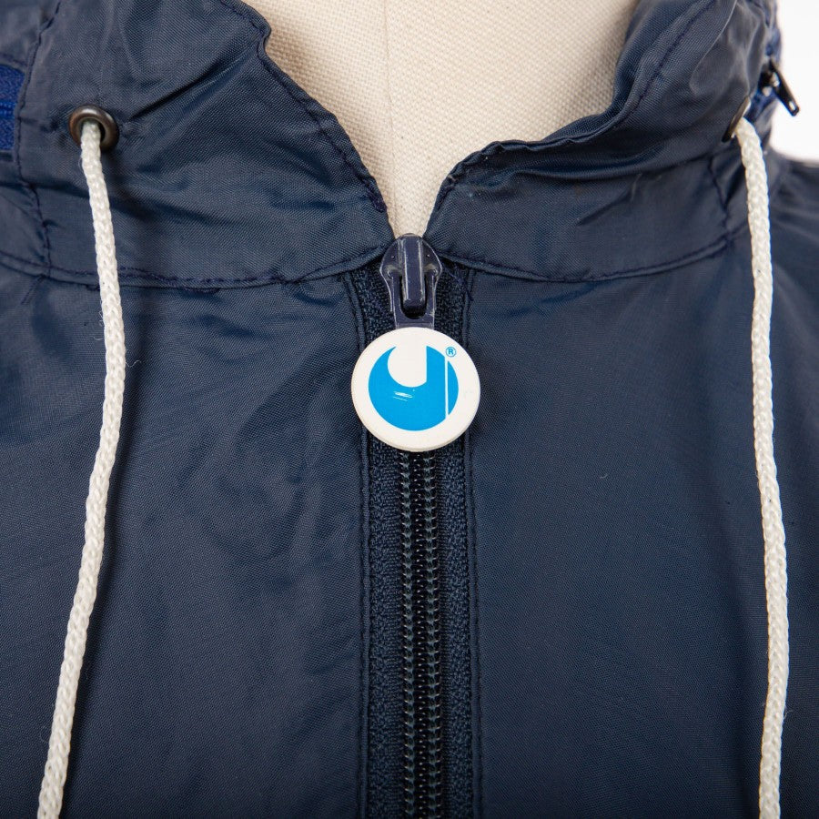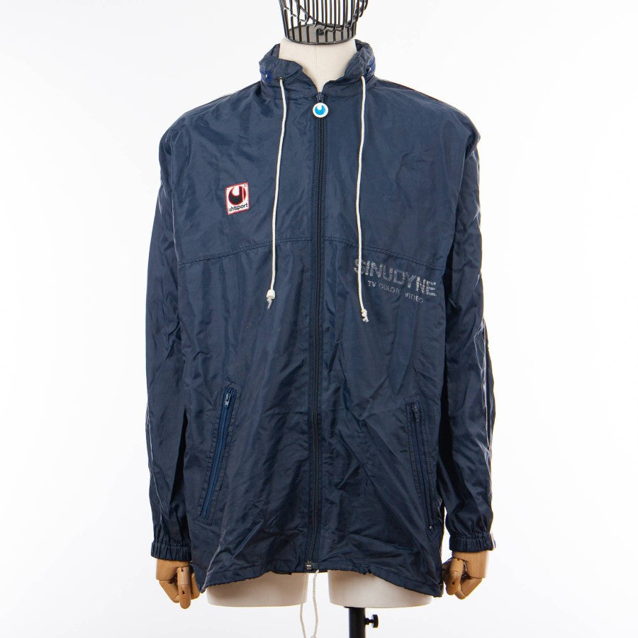 The product is clearly visible from the various photos. The jacket has long sleeves, in blue, with a long zip in the center and two side pockets which also open with zips; in the collar area there are two laces; the logo of the technical sponsor, Uhlsport, is embroidered on the top right, while on the left side of the article there is the wording SINUDYNE painted in white with the subtitle TV COLOR-VIDEO; on the sleeves there is a vertical white band with black edges with the logo of the technical sponsor repeated numerous times.