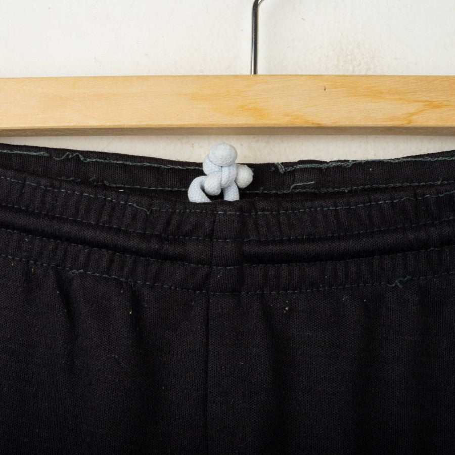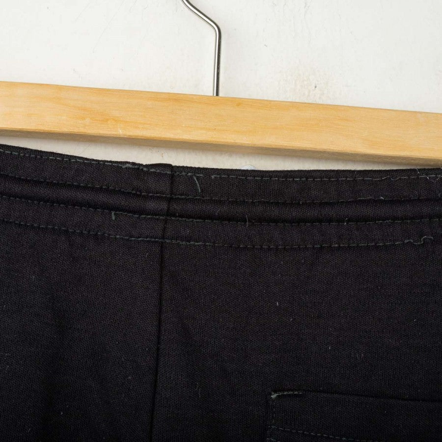 Juventus shorts from the 1990/1991 season, made by Kappa. Black color with white side bands featuring repeated green Kappa logos. Green printed Kappa logo on the left leg. Elastic waistband with internal drawstring. Lightweight polyester fabric, typical of vintage training gear of the era. Size S as per original stitched inner tag. Original vintage shorts from the 1990/1991 season.