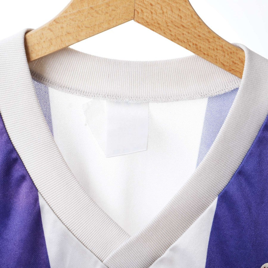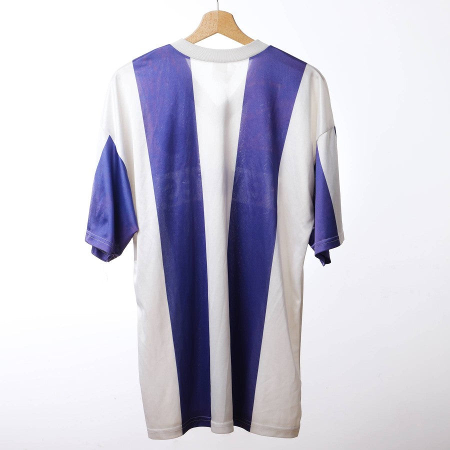 Produced by Adidas for Porto's 1990/1991 season, the home version of the jersey features a white and purple vertical stripe pattern. Short sleeve and V-neck with ribbed trim. The Porto patch is applied in flock on the heart side, on the right side the adidas logo is applied in sublimation. Commercial sponsor Revigras.