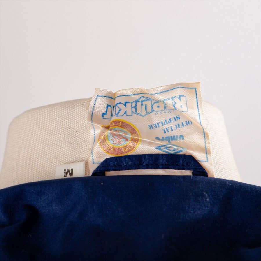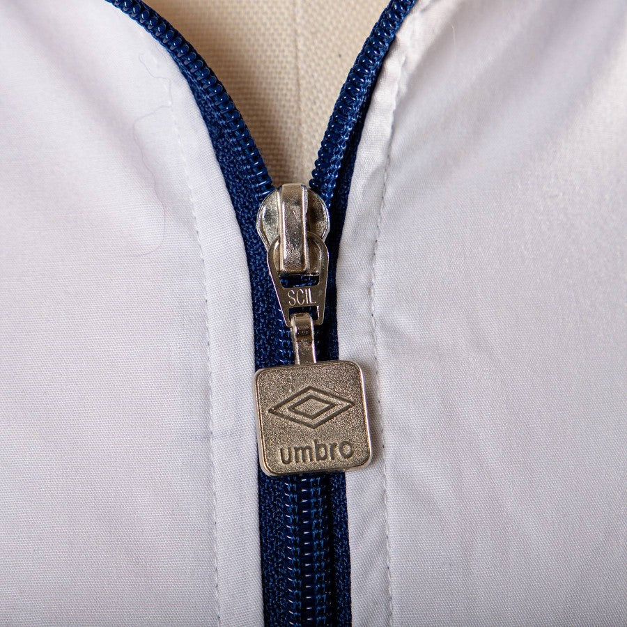 Aston Villa jacket football season 1991/1992. Full zip model in white with blue, light blue and burgundy inserts, equipped with comfortable side pockets. The team patch is embroidered on the heart side and, on the right, the logo of technical sponsor Umbro. Elastics at the waist and wrists make it more practical.