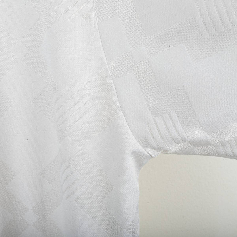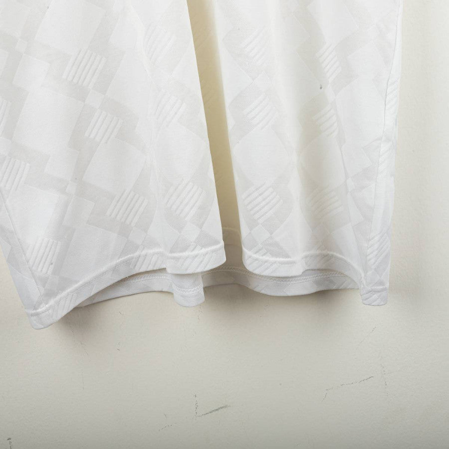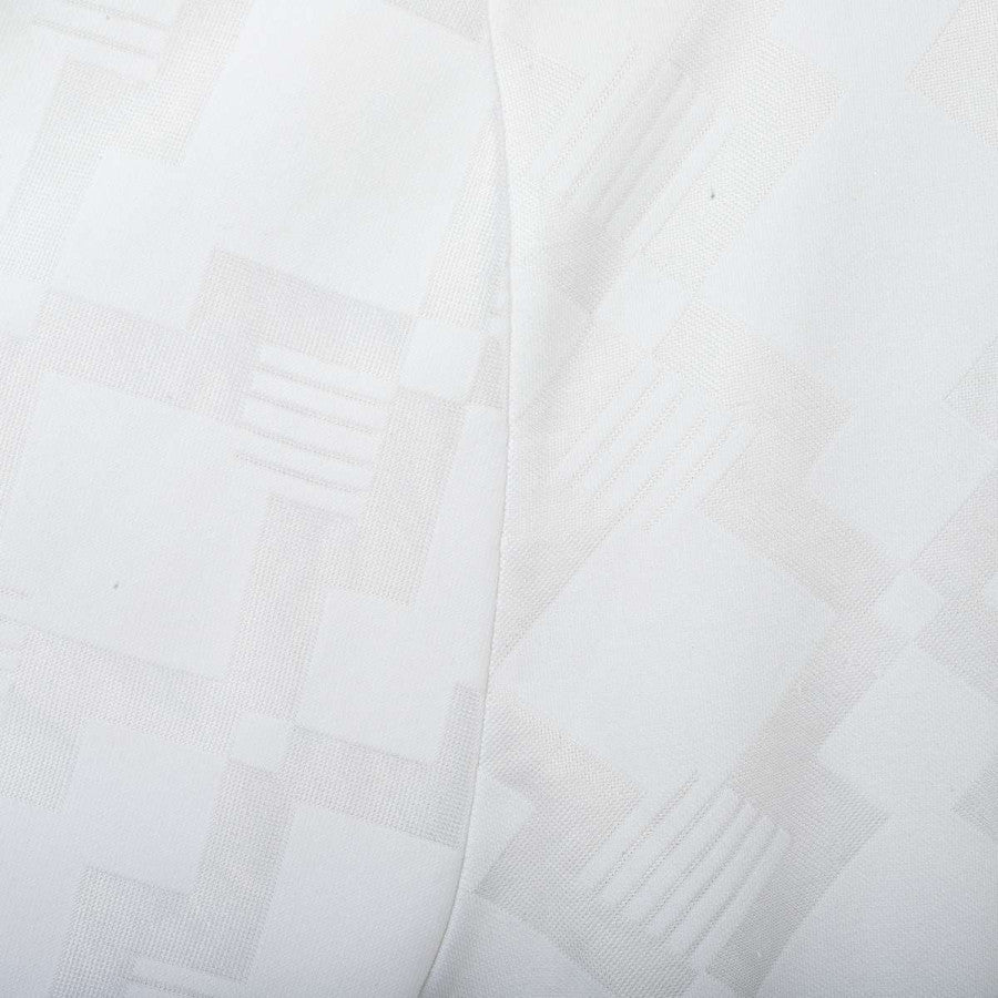 Cagliari away shirt from the 1991/1992 season, made by Umbro. White with tone-on-tone geometric pattern, navy polo collar with white and red details, single-button closure. Navy Umbro logo on the right chest, applied Quattro Mori crest on the left. Sleeve cuffs with navy geometric design. Regular fit. Size L.