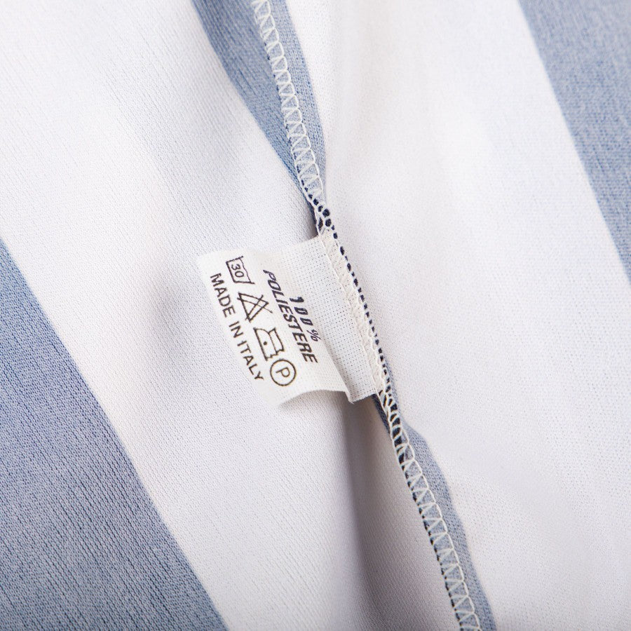 The product is well presented by the different photos. The shirt has long sleeves, with white cuffs and a white stand-up collar, and its predominant colors are white as the background and the black of the vertical stripes that cross it; at the top left two stars are applied in sublimation, while on the opposite side, with the same technique, the logo of Kappa, the technical sponsor of the club, with green colour, is applied; always in sublimation there is the logo of the commercial sponsor, 'upim'.