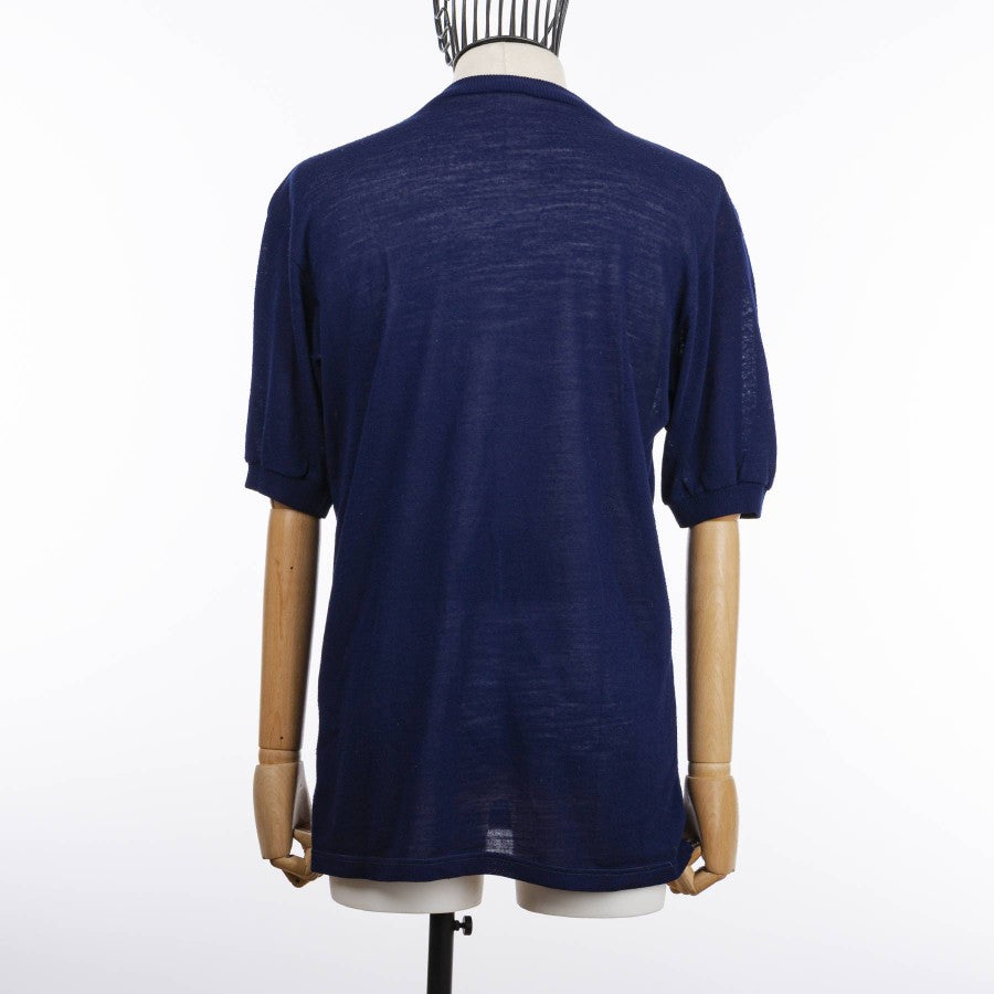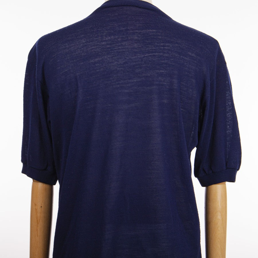 Dark blue short-sleeved training model. The shirt has a V-neck woven in jersey, in correspondence with the edges of the sleeves. The lettering of the Società Sportiva Lazio is embroidered on the fine Scotland thread fabric, on the heart side, the logo of the technical sponsor Umbro is applied on the right, while in the centre, applied in flock, the commercial sponsor Cassa Risparmio Roma.