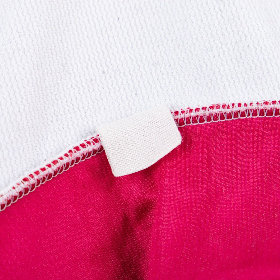 The grenade club's away jersey is white with garnet red inserts. Of the same red are the collar and the pointed neckline, which however also has white stripes.