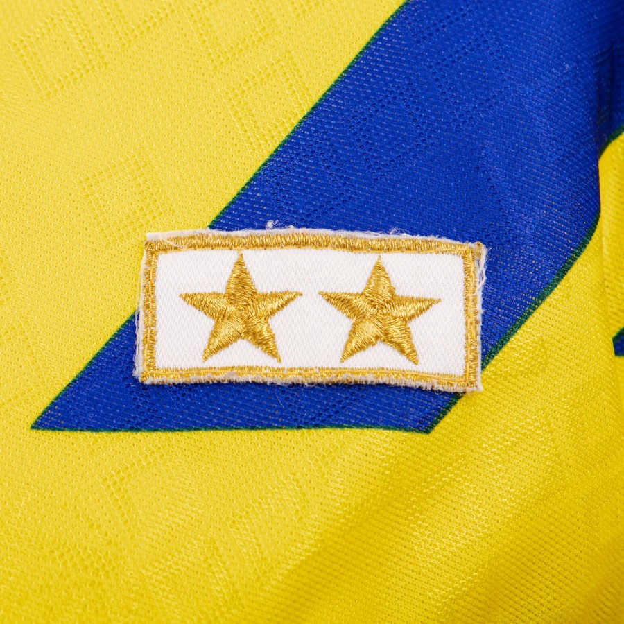 Two gold-colored stars on a white background sewn on the heart side, logo of the technical sponsor Kappa applied on the right side and blue logo of the commercial sponsor Danone legible on the chest.