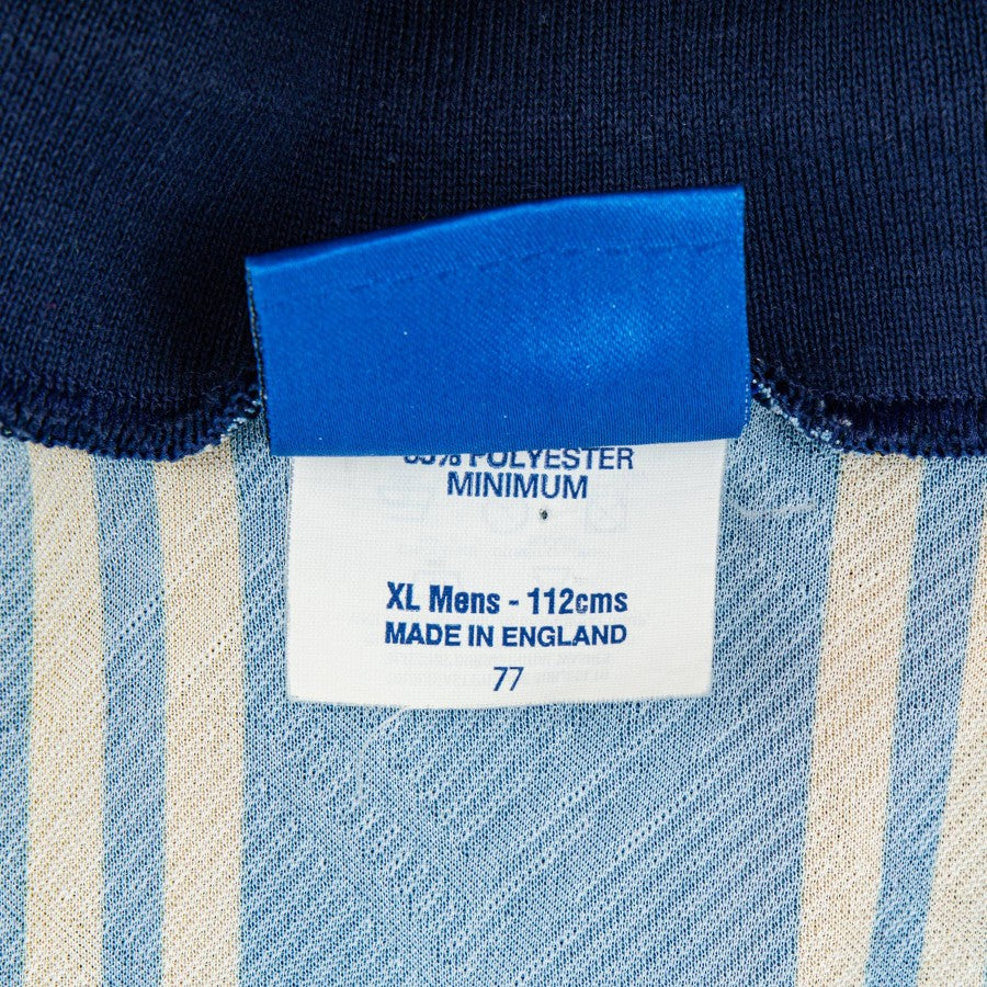 The jersey features a design with a raised collar in blue with gold stripes, matching the rest of the garment. While the club crest is carefully stitched, the Umbro sponsor is embroidered. The central commercial sponsor on the shirt showcases the A-fab brand in flock print.