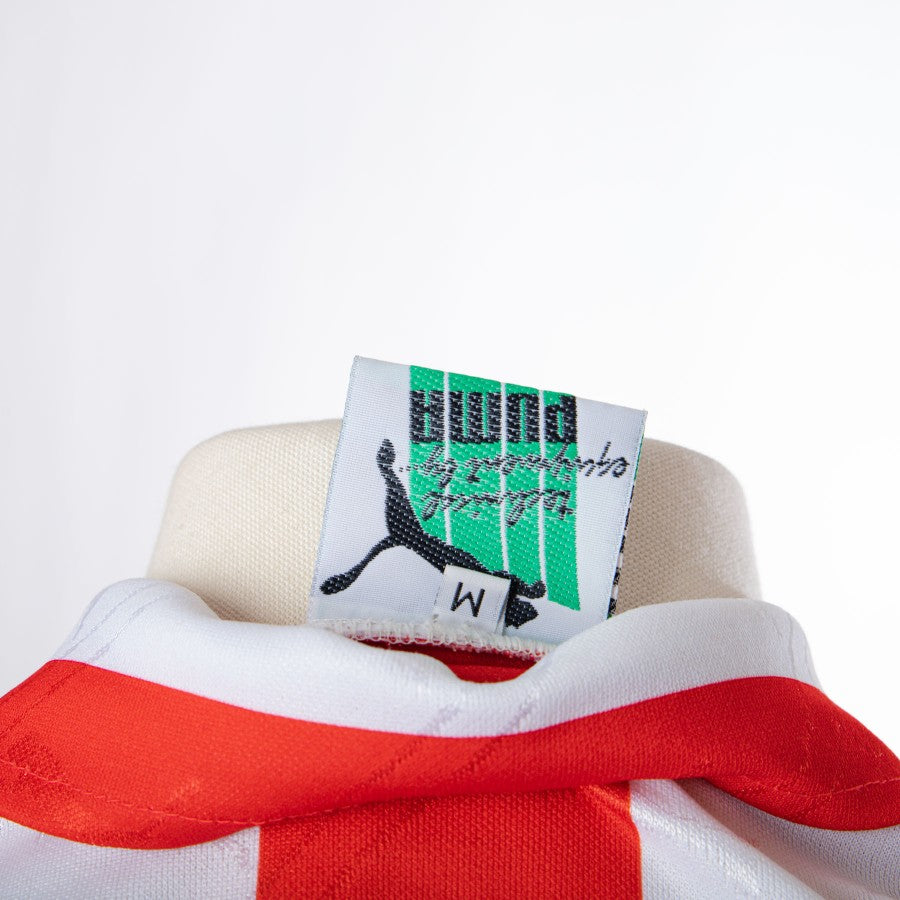 Atletico Madrid's first jersey of the 1993/1994 season, features a red and white vertical striped pattern. Stitched team patch on the heart side and embroidered Puma logo on the right side.