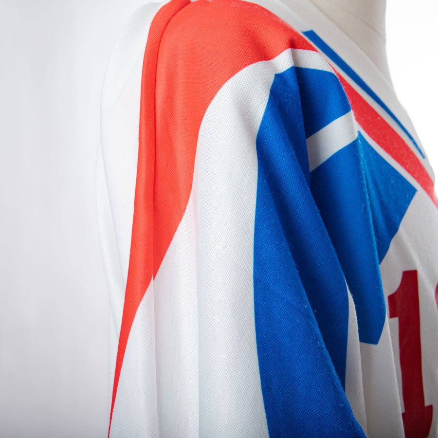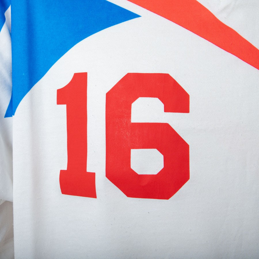 Russian national team jersey used during the world qualifiers for USA 94. Short sleeve version produced by the technical sponsor Reebok. White color, the shirt has embroidered technical sponsor logo and the number 16 in red rubber on both the front and back of the shirt.