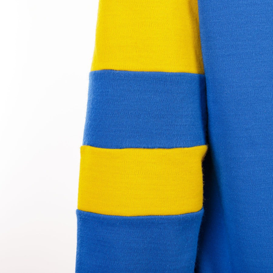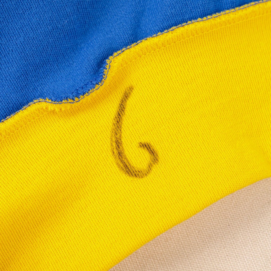 The tracksuit jacket of the Nola team is in yellow and blue, with a full zip closure in white. The emblem of the sports club is sewn on the heart side, while the technical sponsor Errea is visible on the right side. On the back of the product you can see the logo of the commercial sponsor Nusco Wooden doors. The cuffs and the band that ends the bottom of the jacket are in spring fabric.