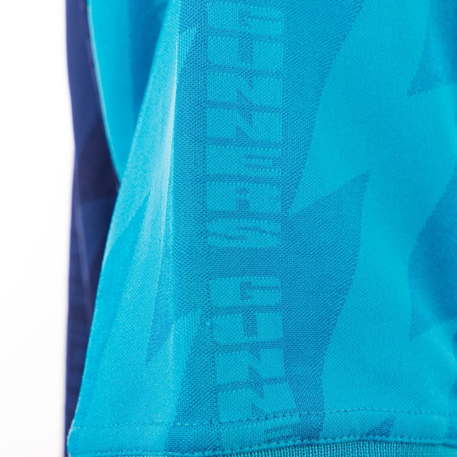 With ribbed polo collar, the Nike logo is embroidered, the Gunners crest is sewn on. The JVC sponsor logo is the flock. The shirt features a zigzag patterned texture and the Gunners wording repeated. On the back is the Arsenal lettering