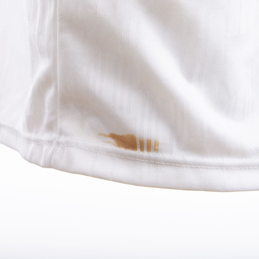 White short-sleeved away shirt with an iridescent texture with diamonds that recalls the technical sponsor. The polo-model collar with snap buttons recalls the colors of the geometric shapes on the shoulders that branch out to the sleeves, making this vintage's model very different from previous years. On the front of the shirt on the heart side, the Napoli crest is sewn on, the Umbro logo is embroidered on the right. In flock the number 8