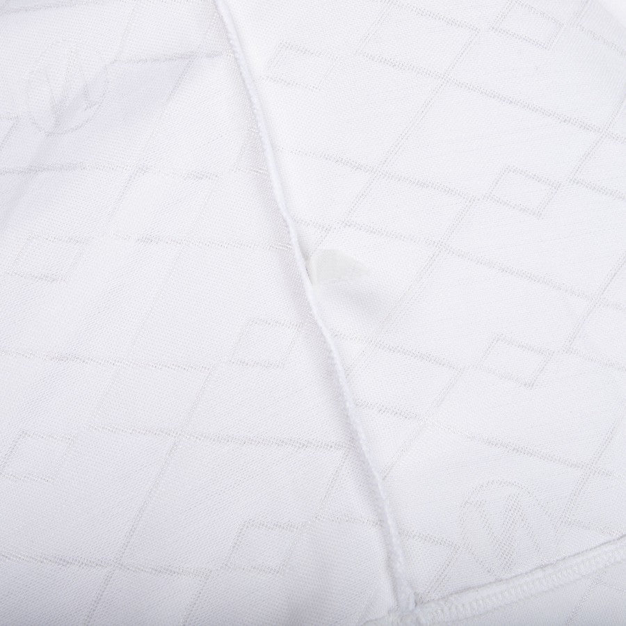 White short-sleeved Napoli Away jersey. On the shoulders and along the sleeves stretches the unique pattern of interwoven stripes with various shades of blue that recall the main colors of the Neapolitan team. On the front, the center features the logo of commercial sponsor Record Cucine in sublimation, the Lotto sponsor embroidered on the right side and the Ssc Napoli crest stitched on the heart side. On the back is the number 4 in sublimation in blue .