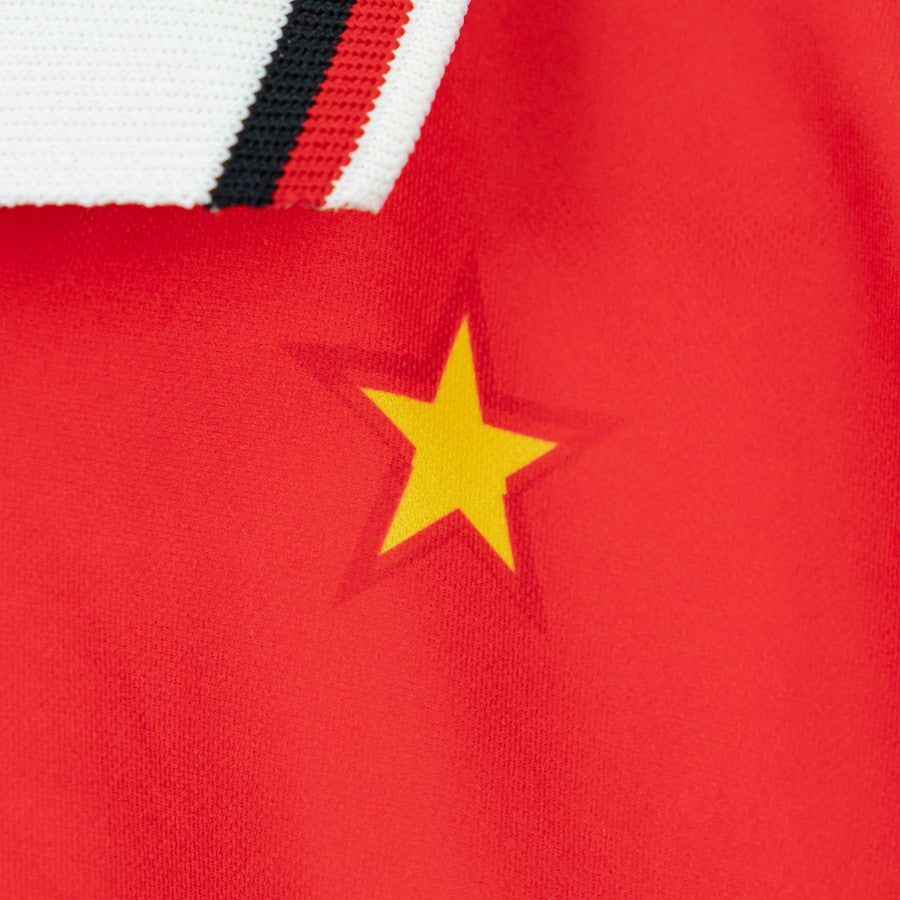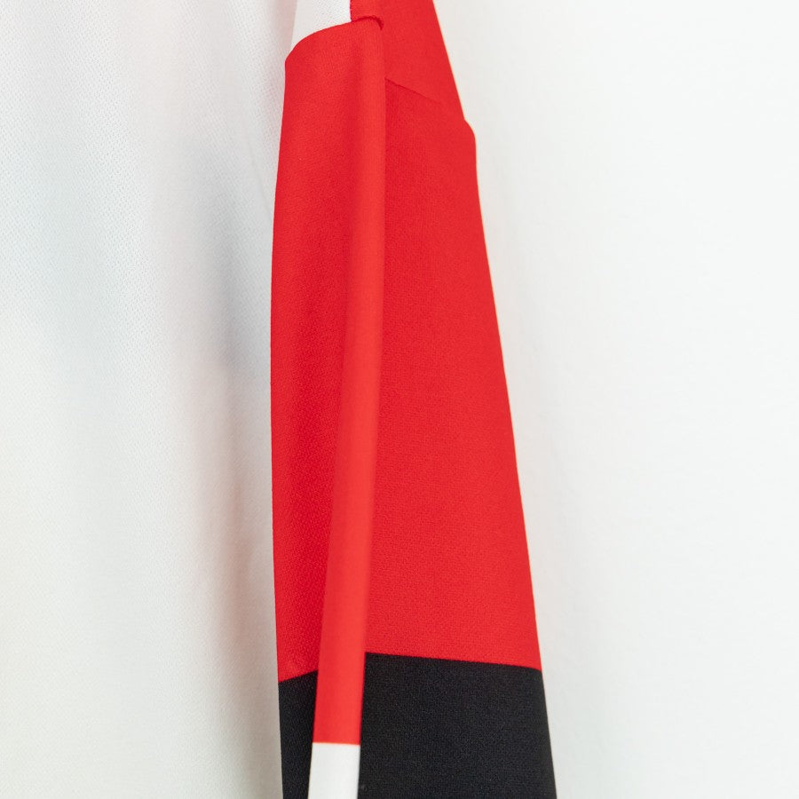 Long-sleeved model in white with red and black inserts with raised collar. On the right Lotto logo in white. Opposite side golden star in a red outline in sublimation printing. Below we find the commercial sponsor Opel.