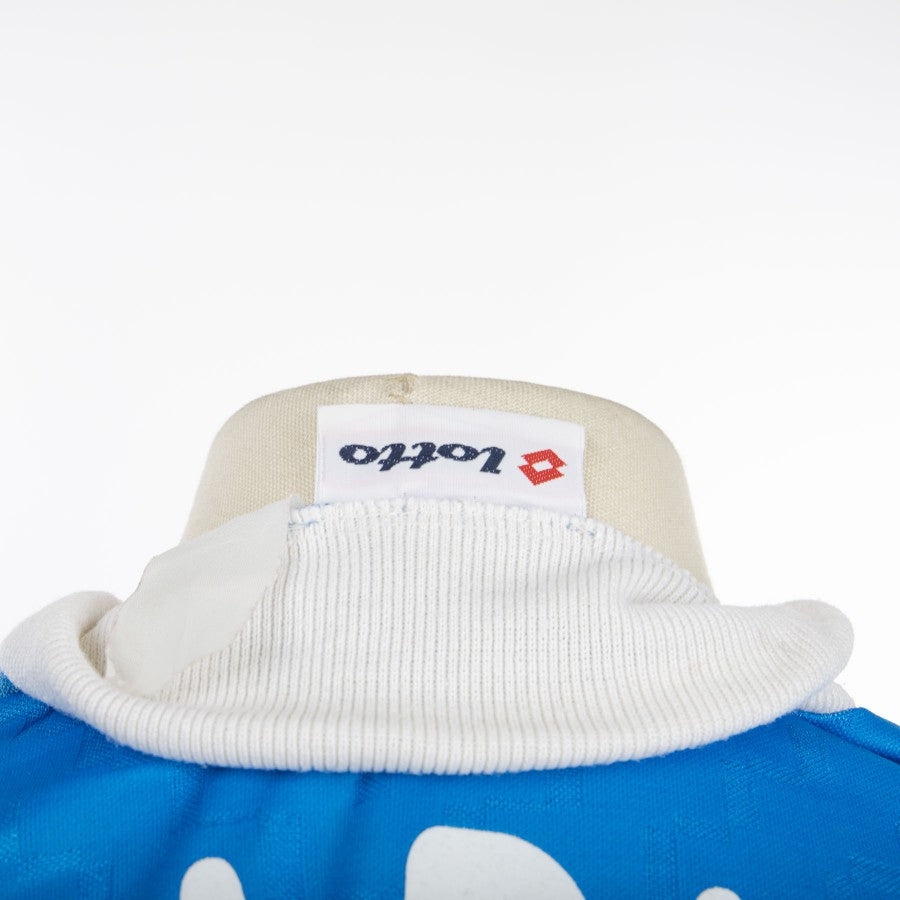 Napoli home shirt made by technical sponsor Lotto for the 1994/1995 season. Product kept in excellent condition, the fabric is soft to the touch, there are no stitching defects, it retains the checkered texture that gives an iridescent light effect. Slightly faded autograph of the footballer. Absent of label, the fit is an XL.