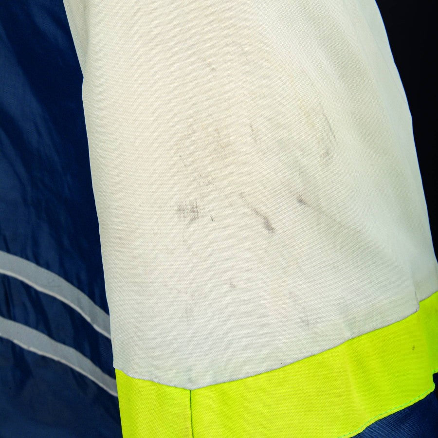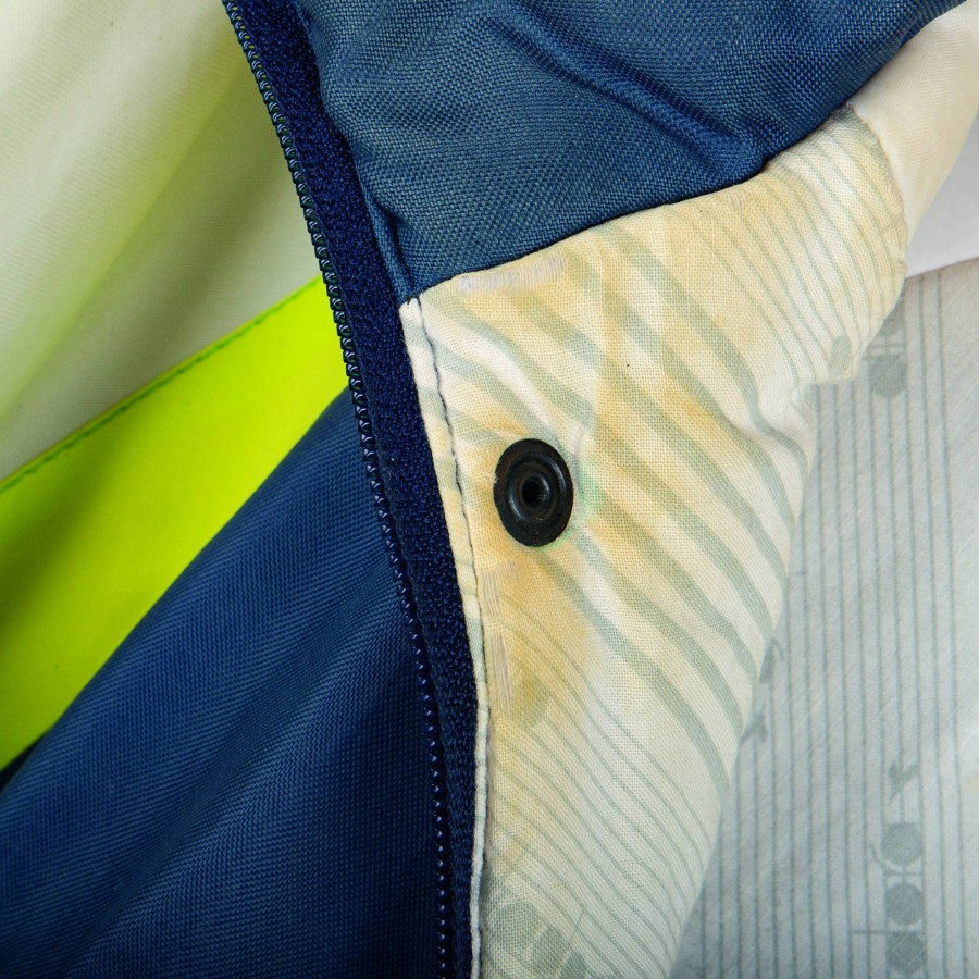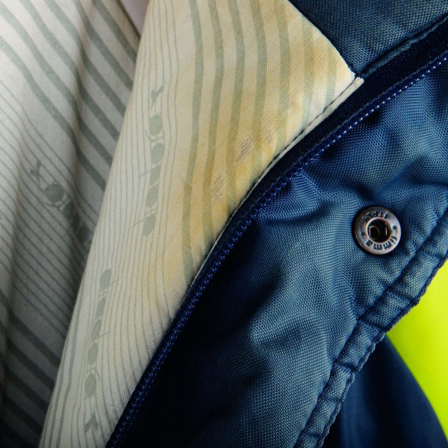 Diadora 1994 Italy jacket, blue model with fluorescent green inserts, on the heart side we find the Italian coat of arms, on the right Diadora embroidered.