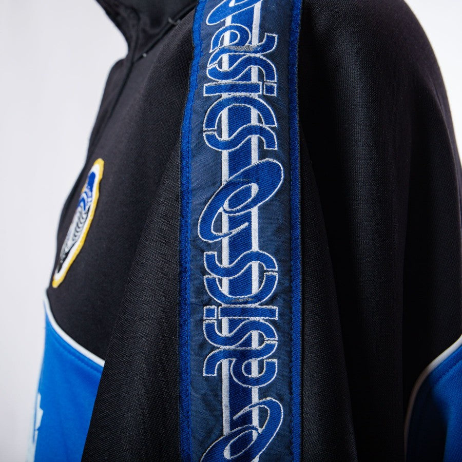 The Atalanta sweatshirt is produced by Asics for the 1995/1996 season. It is a half-zip model. The elastic at the waist and wrists gives a sportier fit. On the shoulders is a band with the logos of the technical sponsor Asics. The commercial sponsor is Somet.