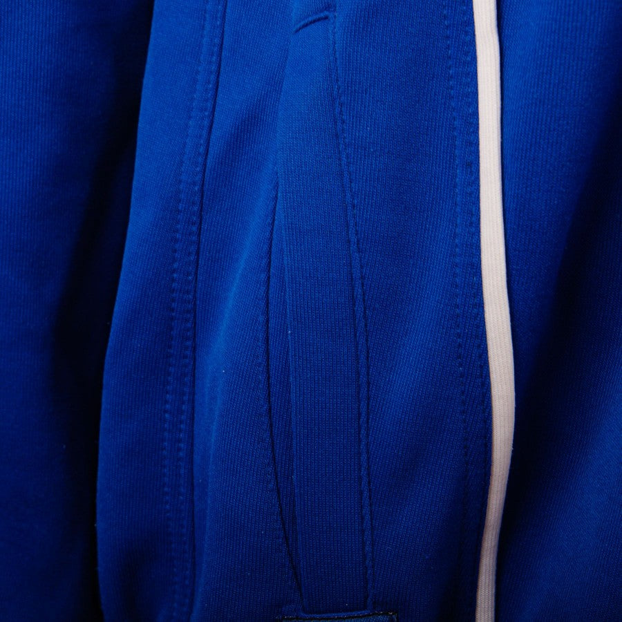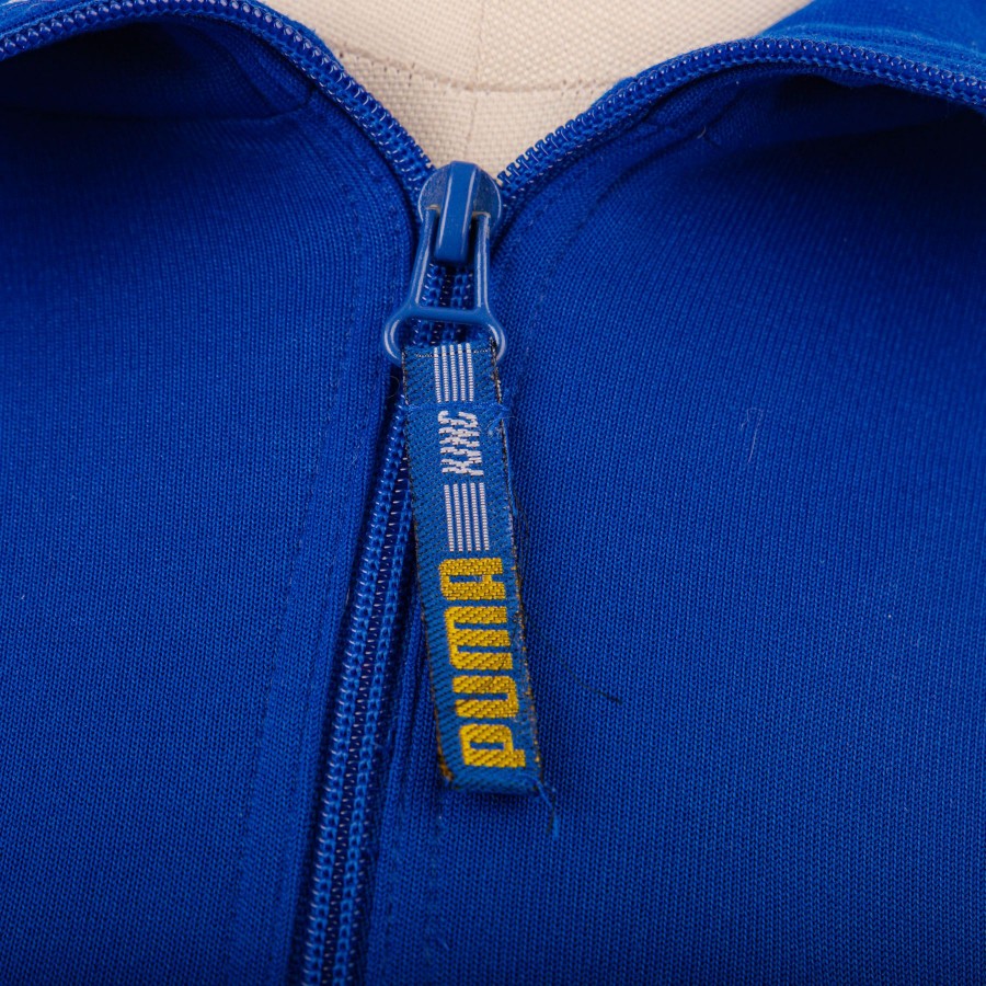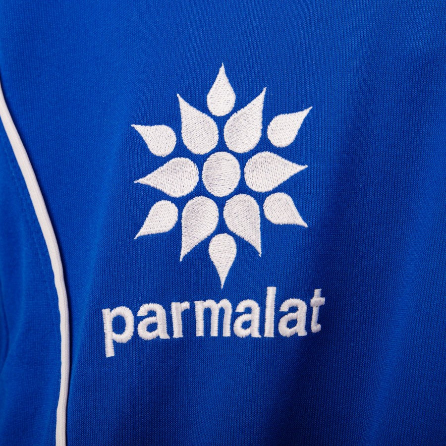 The jacket of the Emilian team is damask blue with white inserts and a yellow stripe that runs along the entire length of the sleeves, where the Parmalat and Puma brands are reproduced in blue. Half zip fastening on the chest and open side pockets on the front.