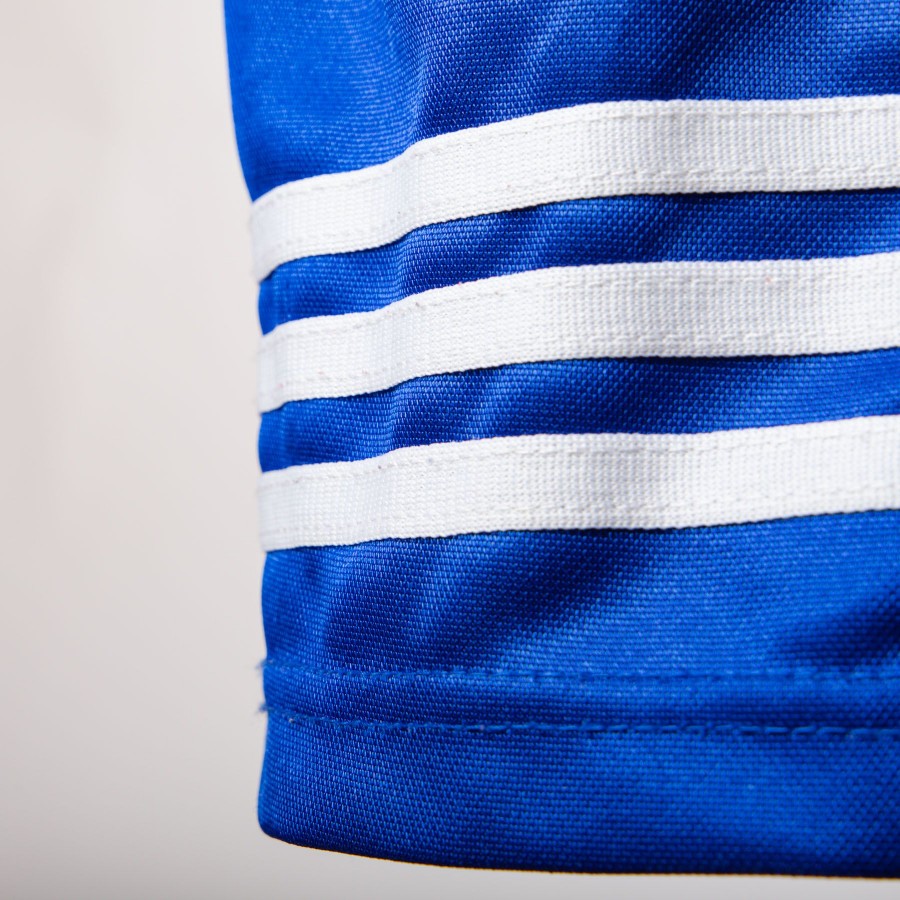 Royal blue model with white details. Technical adidas sponsor in embroidery on the left leg and Bayern Munich patch on the right leg.