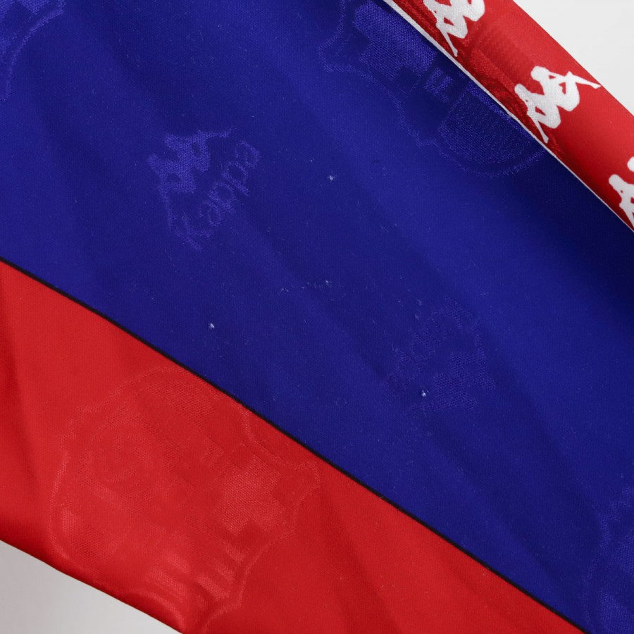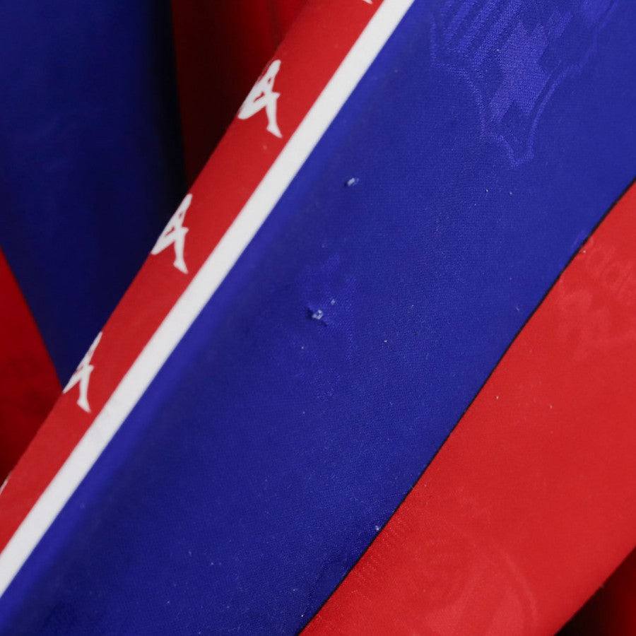FC Barcelona home jersey from the 1992/1993 season, made by technical sponsor Kappa. Features traditional blaugrana vertical stripes, polo collar with button closure. The club crest is stitched on the chest with the European Cup emblem above, and the white Kappa logo is on the opposite side. Iconic Kappa tape runs along the sleeves. Size XL.