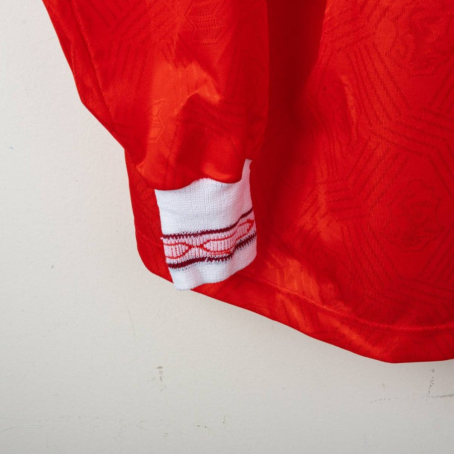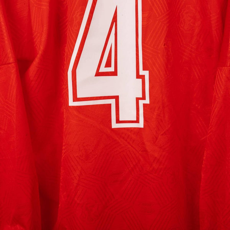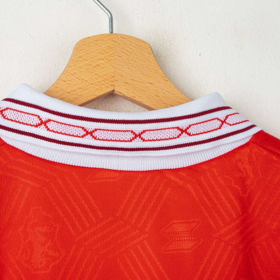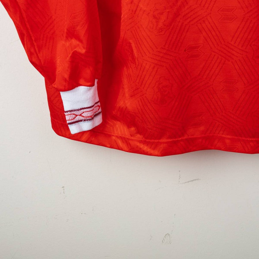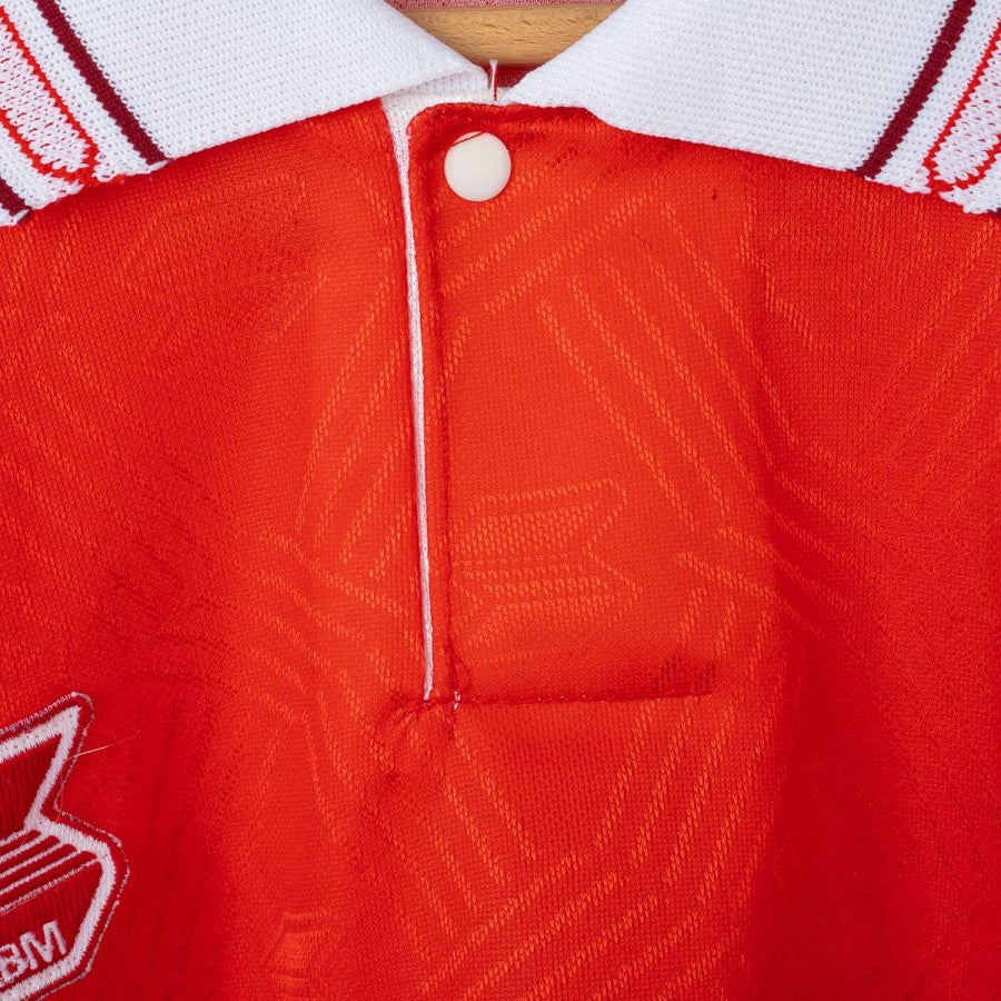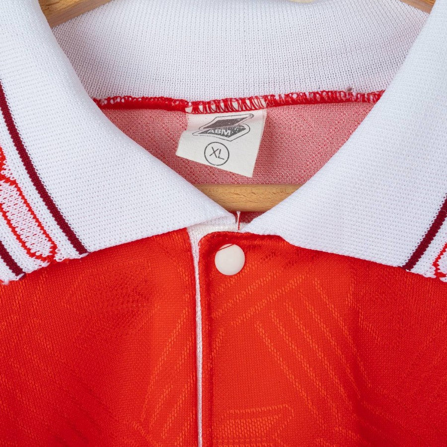 Brescia away shirt from the 1996/1997 season, made by ABM. Bright red base with distinctive white V-shaped band and sublimated LAT sponsor. Subtle geometric patterns woven into the fabric. White polo collar with red graphic trim and button closure. Embroidered ABM logo and yellow lion crest. Long sleeves, size XL, number 4 on the back.