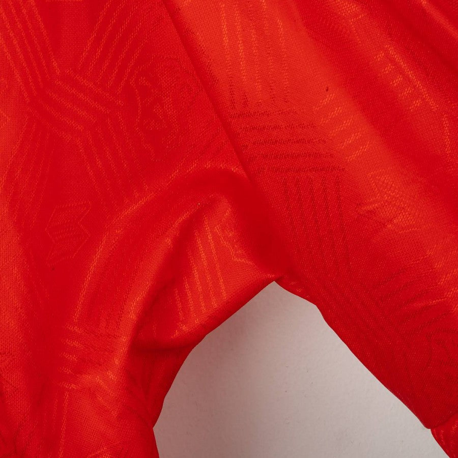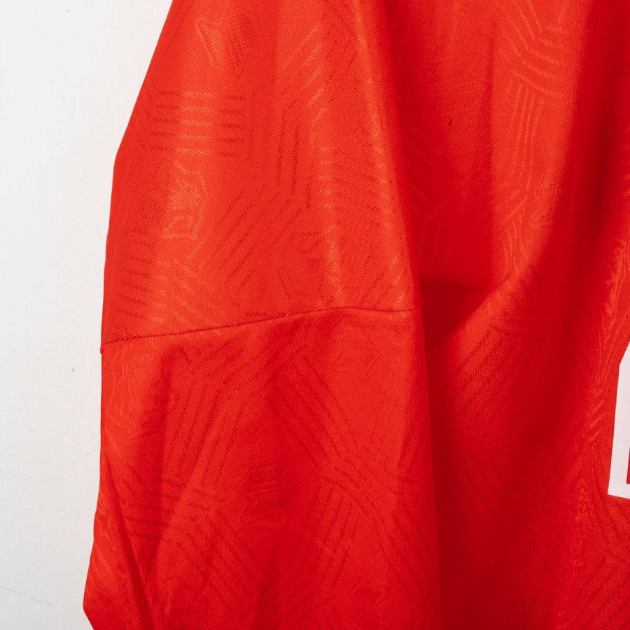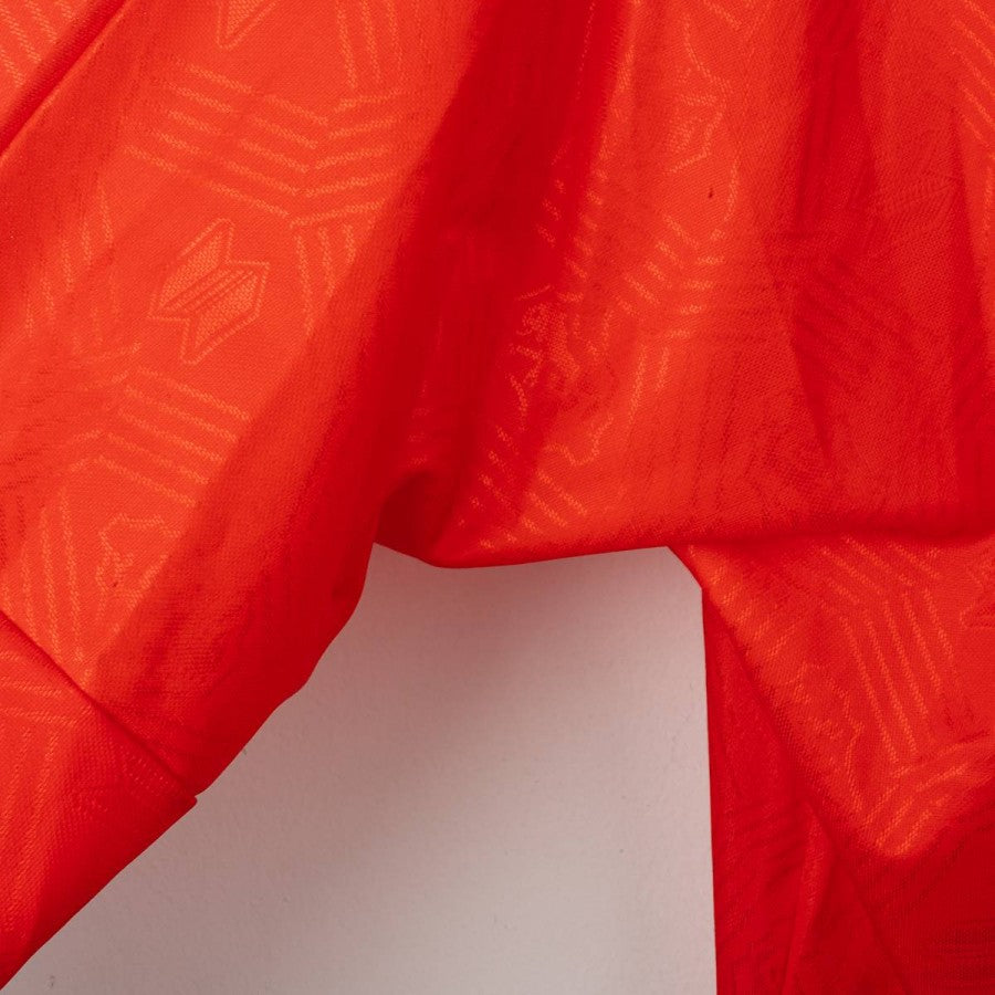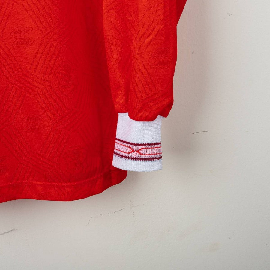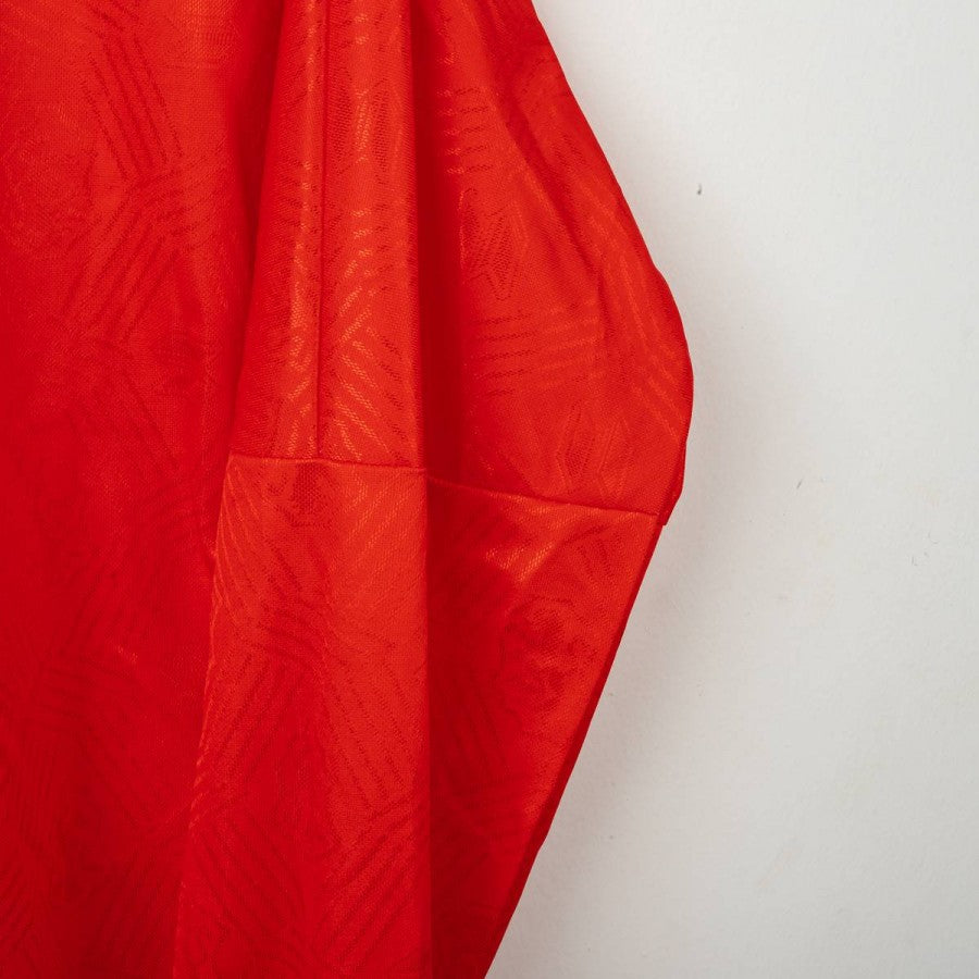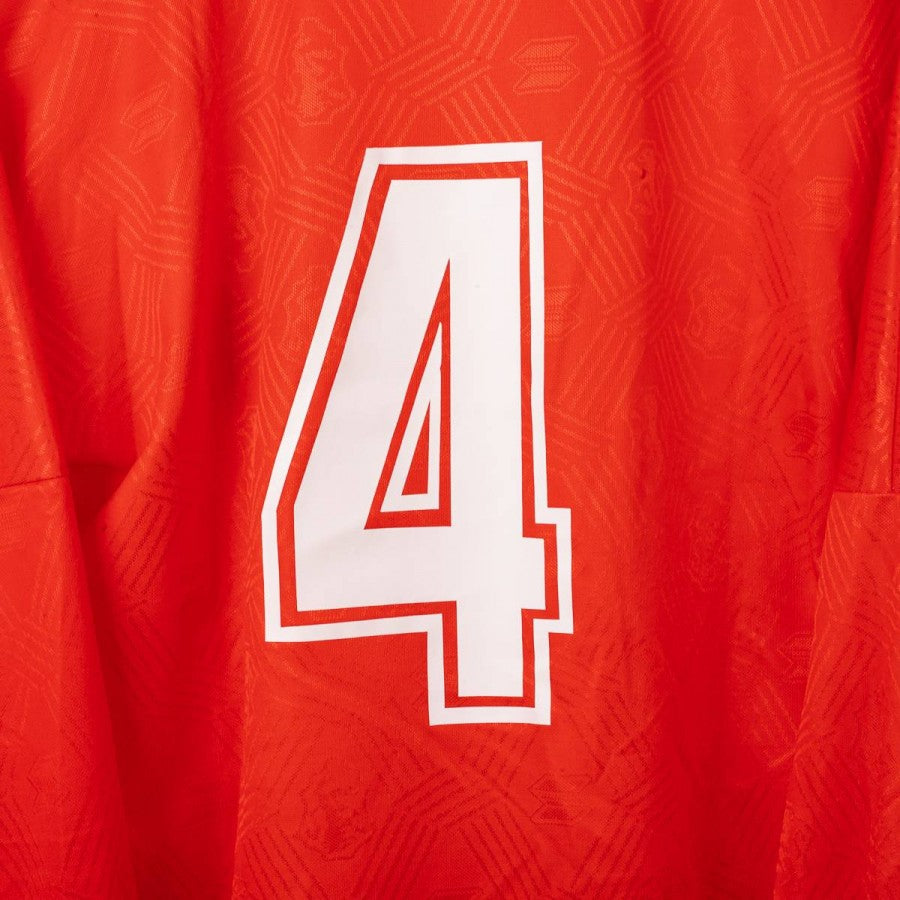 Brescia away shirt from the 1996/1997 season, made by ABM. Bright red base with distinctive white V-shaped band and sublimated LAT sponsor. Subtle geometric patterns woven into the fabric. White polo collar with red graphic trim and button closure. Embroidered ABM logo and yellow lion crest. Long sleeves, size XL, number 4 on the back.