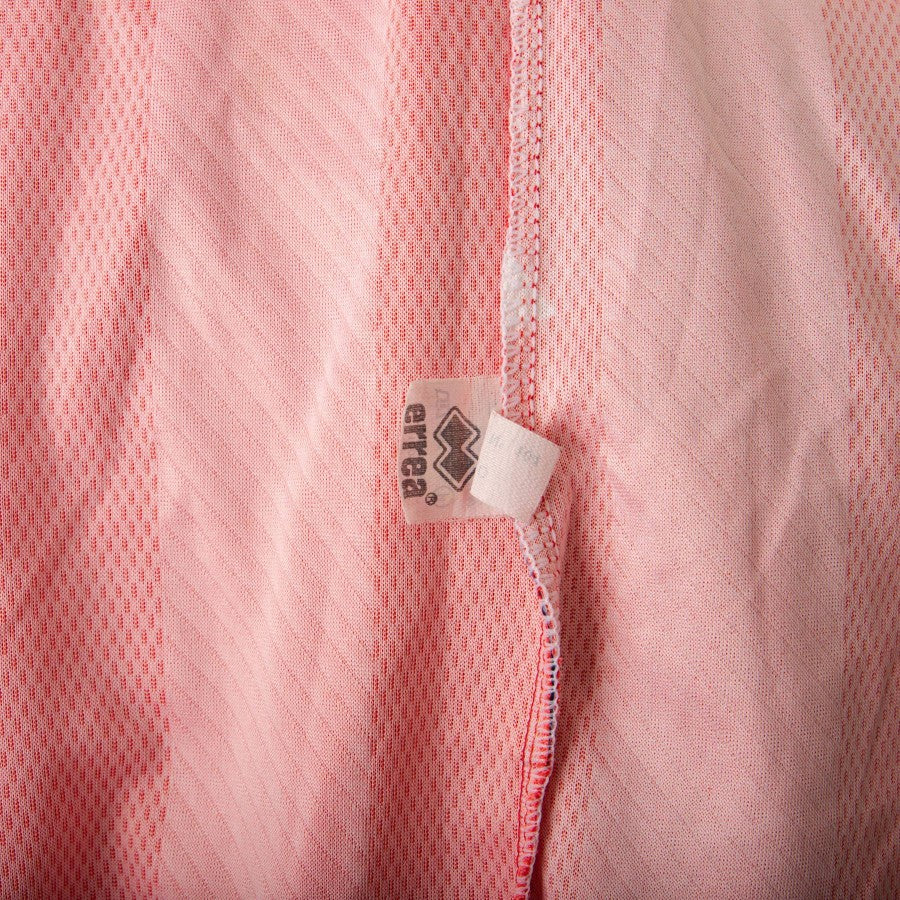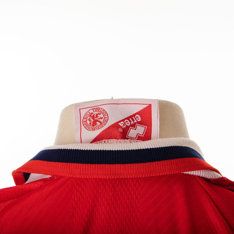 Middlesbrough home model made by Errrea for the 1996/1997 season, in a vibrant red color with white details. Short sleeve and knit polo neck. Technical sponsor applied in sublimation on left, Club patch on left sleeve and Cellnet commercial sponsor in center. On the back, applied in white flock, the number 6.