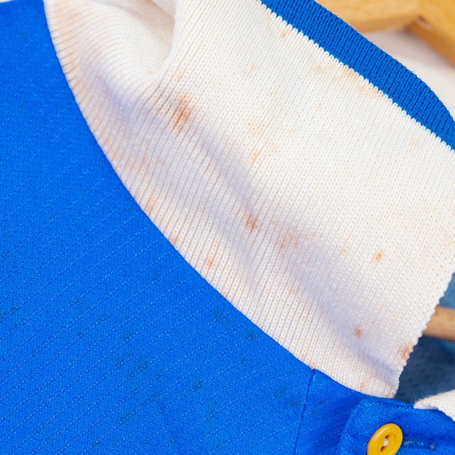 Long-sleeved model in light blue with white inserts and polo collar with button. On the heart side there is the Napoli coat of arms, on the right the technical sponsor Lotto. In the centre, the commercial sponsor Centrale Latte di Napoli.